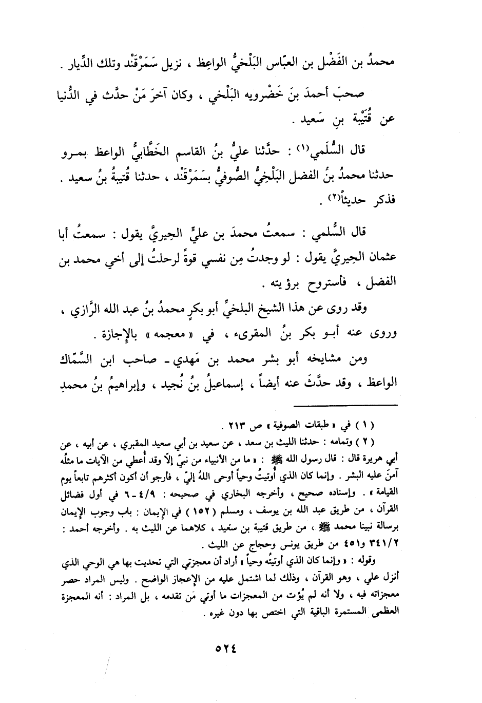 قَالَ السُّلَمِيُّ (1) :حَدَّثَنَا عَلِيُّ بنُ القَاسِمِ الخَطَّابِيُّ الوَاعِظُ بِمَرْوَ، حَدَّثَنَا مُحَمَّدُ بنُ الفَضْلِ البَلْخِيُّ الصُّوْفِيُّ بِسَمَرْقَنْدَ، حَدَّثَنَا قُتَيْبَةُ بنُ سَعِيْدٍ.