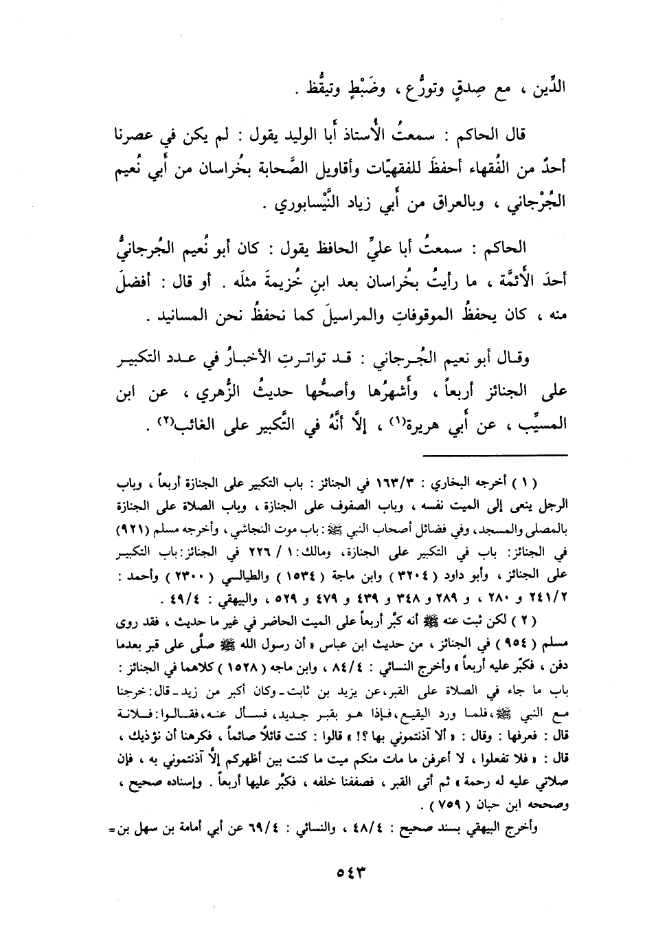وَقَالَ أَبُو نُعَيْمٍ الجُرْجَانِيُّ: قَدْ تَوَاتَرَتِ الأَخْبَارُ فِي عَدَدِ التَّكبِيْرِ عَلَى الجَنَائِزِ أَرْبَعاً، وَأَشهَرُهَا وَأَصحُّهَا: حَدِيْثُ الزُّهْرِيِّ، عَنِ ابْنِ المُسَيِّبِ، عَنْ أَبِي هُرَيْرَةَ (1) ، إِلاَّ أَنَّهُ فِي التَّكْبِيْرِ عَلَى الغَائِبِ.