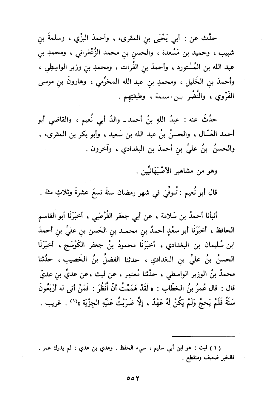 أَنْبَأَنَا أَحْمَدُ بنُ سَلاَمَةَ، عَنْ أَبِي جَعْفَرٍ القُرْطُبِيِّ، أَخْبَرَنَا أَبُو القَاسِمِ الحَافِظُ، أَخْبَرَنَا أَبُو سَعْدٍ أَحْمَدُ بنُ مُحَمَّدِ بنِ الحَسَنِ بنِ عَلِيِّ بنِ أَحْمَدَ بنِ سُلَيْمَانَ بنِ البَغْدَادِيِّ، أَخْبَرَنَا مَحْمُوْدُ بنُ جَعْفَرٍ الكَوْسَجُ، أَخْبَرَنَا الحَسَنُ بنُ عَلِيِّ بنِ البَغْدَادِيِّ، حَدَّثَنَا الفَضْلُ بنُ الخَصِيْبِ، حَدَّثَنَا مُحَمَّدُ بنُ الوَزِيْرِ الوَاسِطِيُّ، حَدَّثَنَا مُعْتَمِرٌ، عَنْ لَيْثٍ، عَنْ عَدِيِّ بنِ عَدِيٍّ، قَالَ: