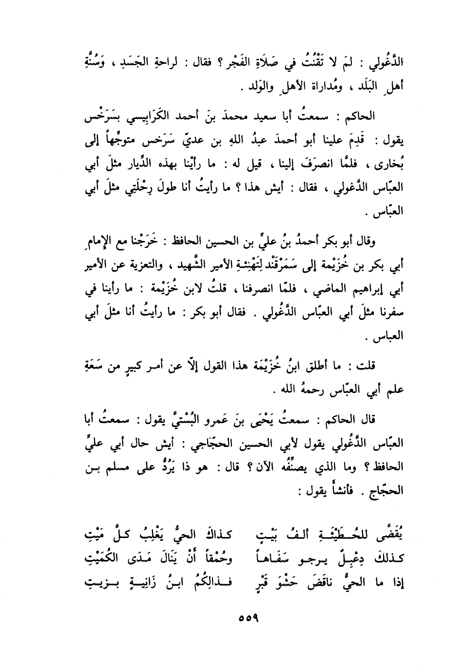 وَقَالَ أَبُو بَكْرٍ أَحْمَدُ بنُ عَلِيِّ بنِ الحُسَيْنِ الحَافِظُ: خَرَجْنَا مَعَ الإِمَامِ أَبِي بَكْرٍ بنِ خُزَيْمَةَ إِلَى سَمَرْقَنْدَ لِتَهْنِئَةِ الأَمِيْرِ الشَّهِيْدِ، وَالتَّعزِيَةِ عَنِ الأَمِيْرِ أَبِي إِبْرَاهِيْم المَاضِي، فَلَمَّا انْصَرَفنَا، قُلْتُ لاِبْنِ خُزَيْمَةَ: مَا رَأَينَا فِي سَفَرِنَا مِثْلَ أَبِي العَبَّاسِ الدَّغُوْلِيِّ.