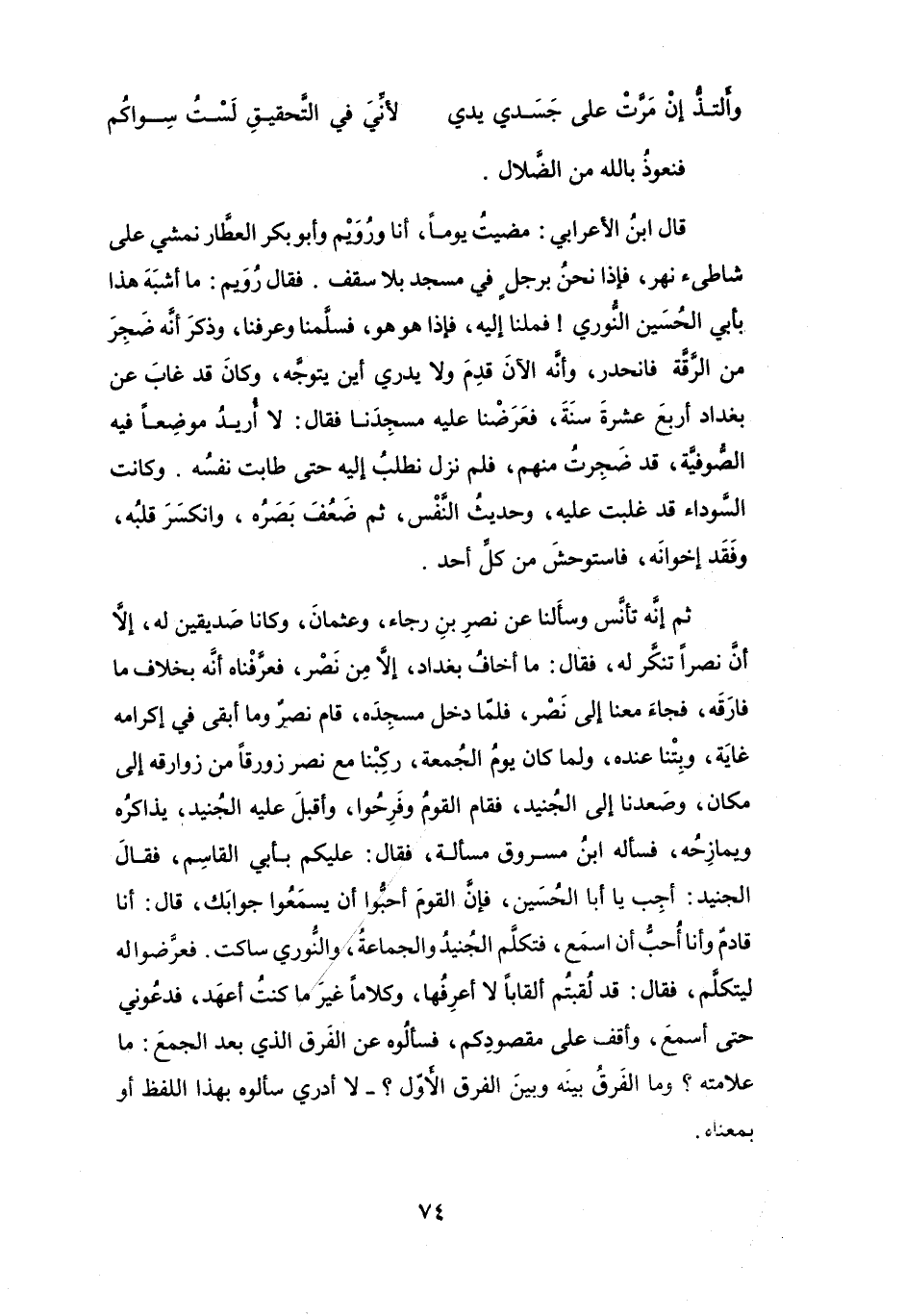 فَقَالَ الجُنَيْدُ: أَجِبْ يَا أَبَا الحُسَيْنِ، فَإِنَّ القَوْمَ أَحَبُّوا أَنْ يَسْمَعُوا جَوَابَكَ.