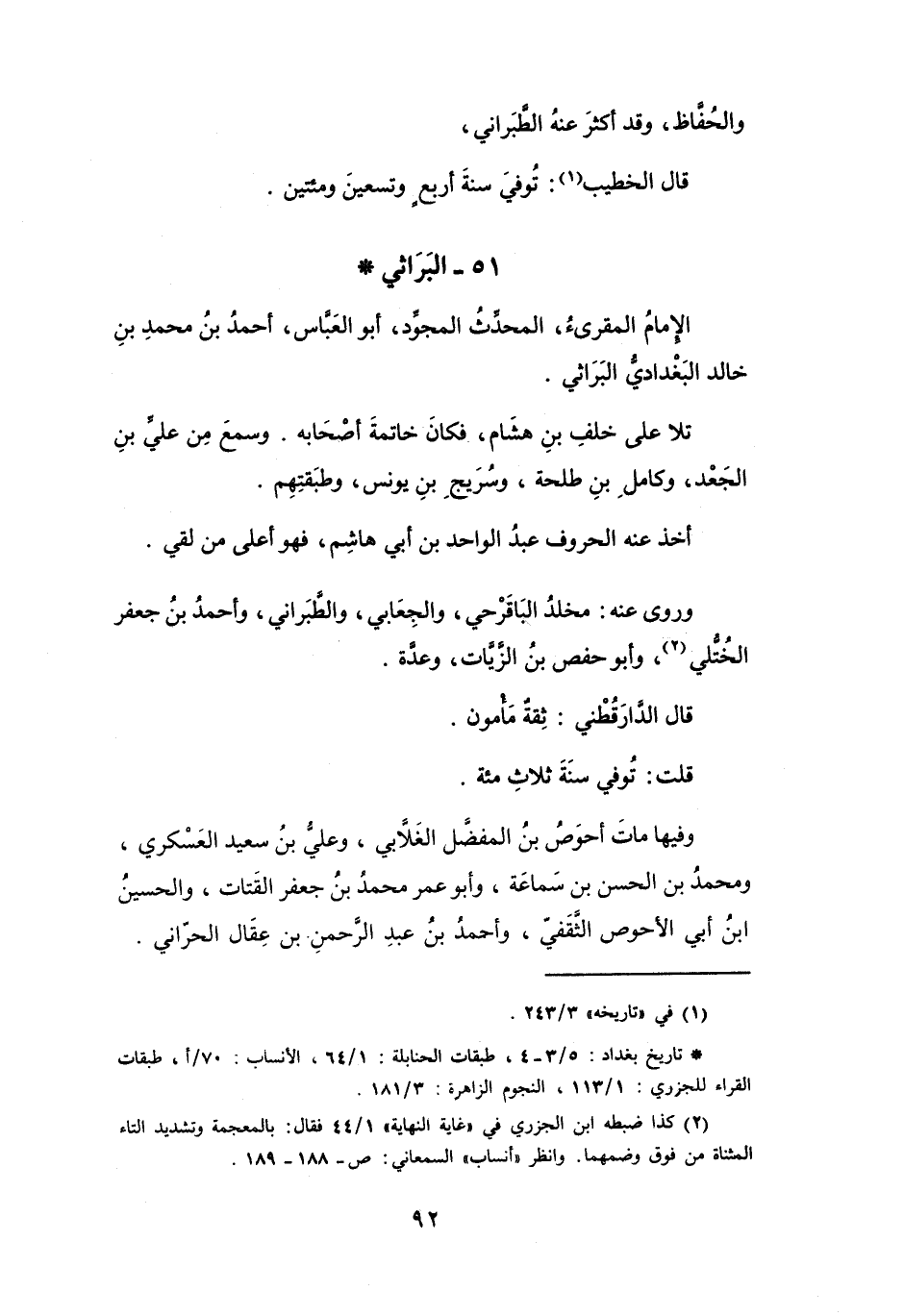 (*) تاريخ بغداد: 5 / 4 3، طبقات الحنابلة: 1 / 64، الأنساب: 70 / أ، طبقات القراء للجزري: 1 / 113، النجوم الزاهرة: 3 / 181.