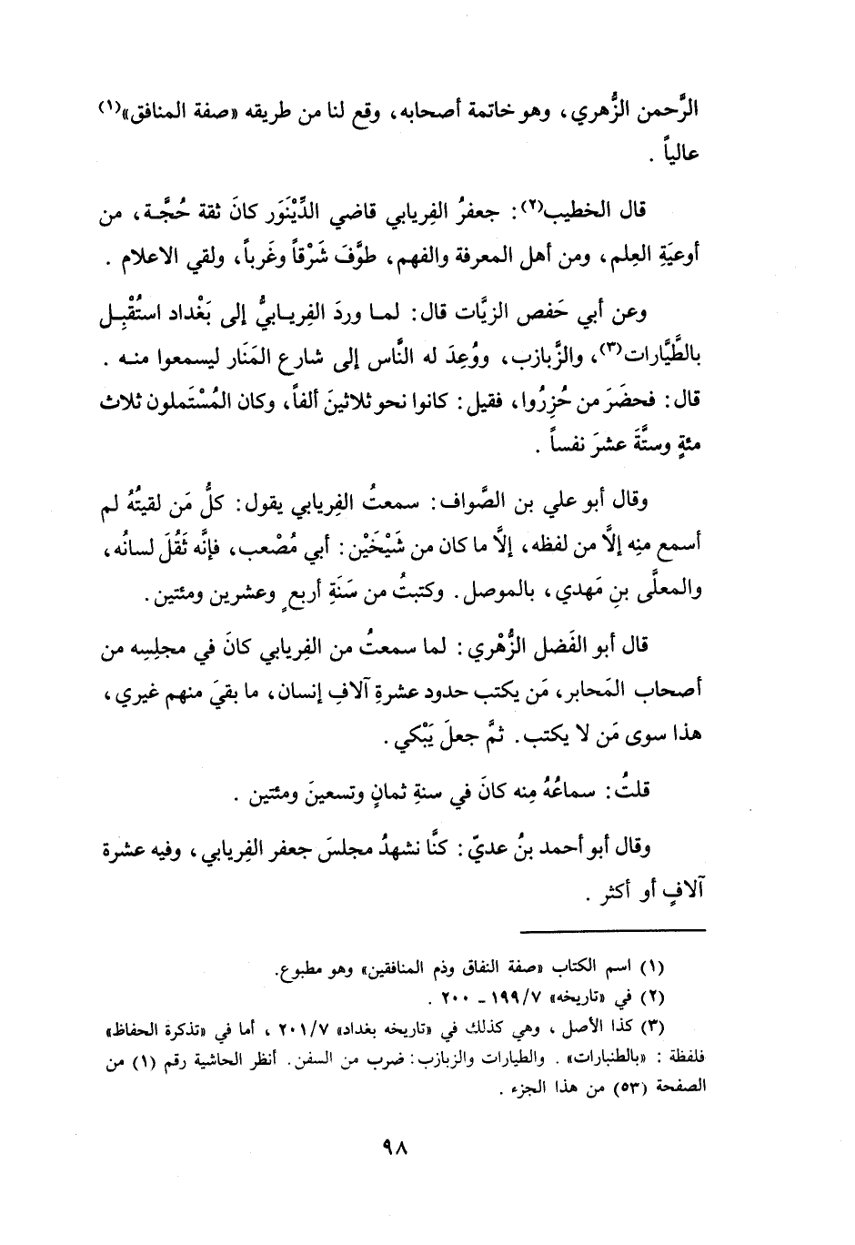 الرَّحْمَنِ الزُّهْرِيُّ، وَهُوَ خَاتِمَةُ أَصْحَابِهِ، وَقَعَ لَنَا مِنْ طَرِيْقِهِ (صِفَةُ المُنَافِقِ (1)) عَالِياً.