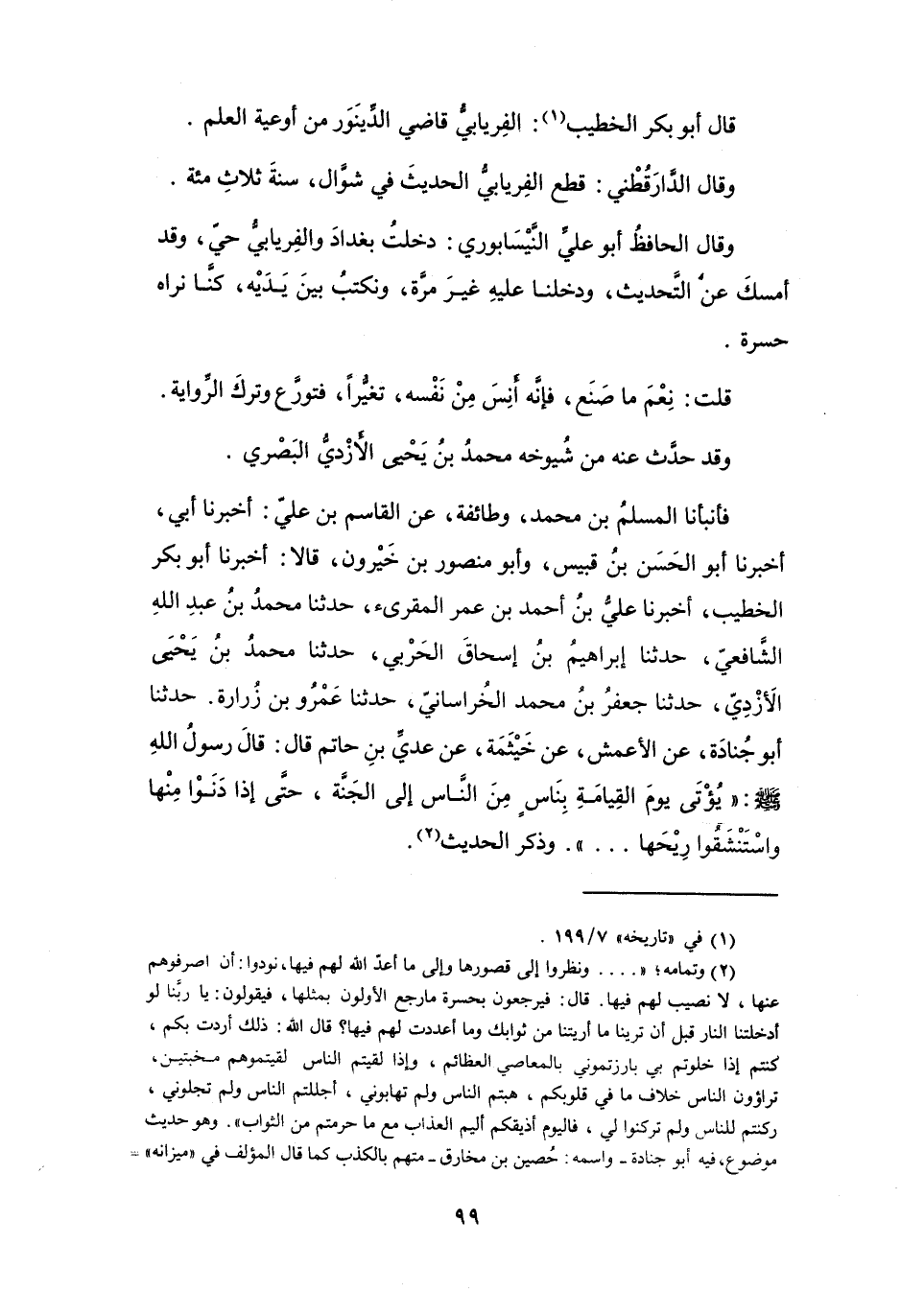 أَخْبَرَنَا أَبُو بَكْرٍ الخَطِيْبُ، أَخْبَرَنَا عَلِيُّ بنُ أَحْمَدَ بنِ عُمَرَ المُقْرِئُ، حَدَّثَنَا مُحَمَّدُ بنُ عَبْدِ اللهِ الشَّافِعِيُّ، حَدَّثَنَا إِبْرَاهِيْمُ بنُ إِسْحَاقَ الحَرْبِيُّ، حَدَّثَنَا مُحَمَّدُ بنُ يَحْيَى الأَزْدِيُّ، حَدَّثَنَا جَعْفَرُ بنُ مُحَمَّدٍ الخُرَاسَانِيُّ، حَدَّثَنَا عَمْرُو بنُ زُرَارَةَ، حَدَّثَنَا أَبُو جُنَادَةَ، عَنِ الأَعْمَشِ، عَنْ خَيْثَمَةَ، عَنْ عَدِيِّ بنِ حَاتِمٍ، قَالَ: