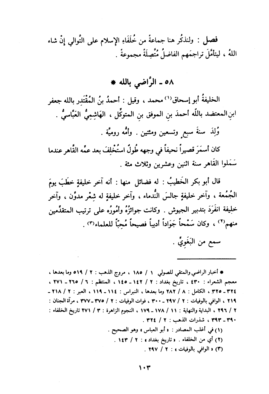 فَصْلٌ: وَلنَذْكُرْ هُنَا جَمَاعَةً مِنْ خُلَفَاءِ الإِسْلاَمِ عَلَى التَّوَالِي - إِنْ شَاءَ اللهُ - لِيتَأَمَّلَ تَرَاجِمَهُمُ الفَاضِلُ مُتَّصِلَةً مَجْمُوْعَةً