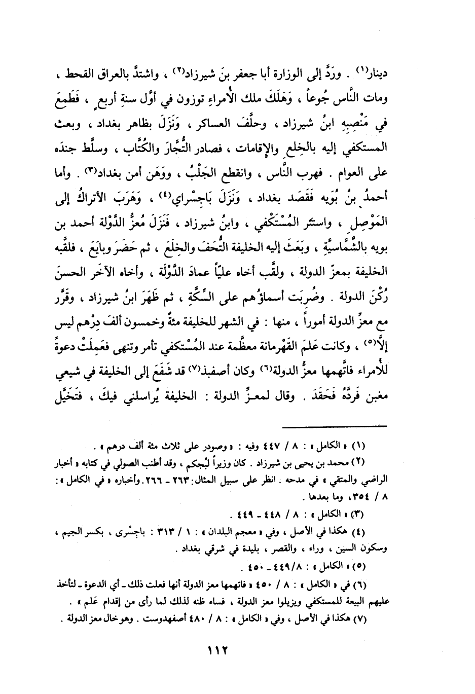 (6) في " الكامل ": 8 / 450 " فاتهمها معز الدولة أنها فعلت ذلك - أي الدعوة - لتأخذ عليهم البيعة للمستكفي ويزيلوا معز الدولة، فساء ظنه لذلك لما رأى من إقدام علم ".