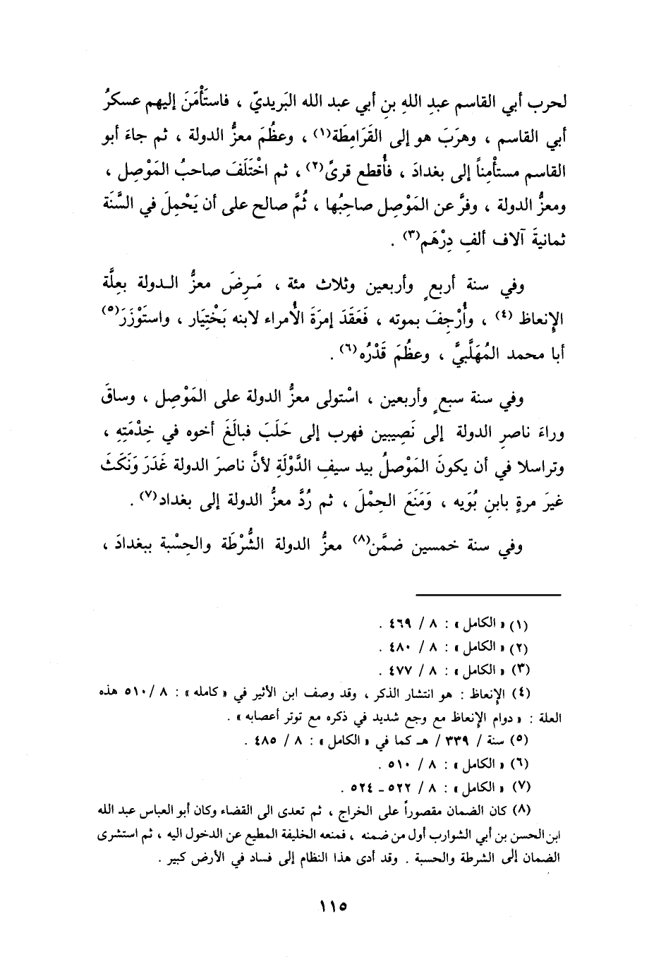 لِحَرْب أَبِي القَاسِمِ عَبْدِ اللهِ بنِ أَبِي عَبْدِ اللهِ البَريديّ، فَاسْتَأمَنَ إِلَيْهِم عَسْكَرُ أَبِي القَاسِمِ، وَهَرَبَ هُوَ إِلَى القَرَامِطَة (1) ، وَعظُمَ معزُّ الدَّوْلَة، ثُمَّ جَاءَ أَبُو القَاسِمِ مستَأمناً إِلَى بَغْدَادَ، فَأُقطع قرَىً (2) ، ثُمَّ اخْتَلَفَ صَاحِبُ المَوْصِل، وَمعزُّ الدَّوْلَة، وَفَرَّ عَنِ المَوْصِل صَاحِبُهَا، ثُمَّ صَالح عَلَى أَنْ يَحْمِلَ فِي السَّنَة ثَمَانيَةَ آلاَف أَلفِ دِرْهَم (3) .