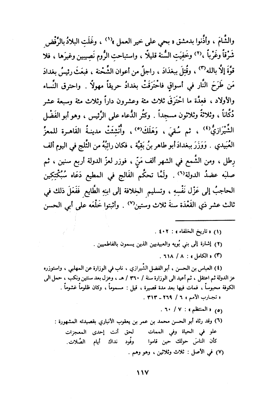 وَالشَّامَ، وَأَذَّنُوا بِدِمَشْقَ بحِي عَلَى خَيْر الْعَمَل (1) ، وَغَلَتِ البِلاَدُ بِالرَّفْضِ شَرْقاً وَغَرْباً (2) ، وَخَفِيَتِ السُّنَّة قَلِيْلاً، وَاسْتبَاحتِ الرُّوْم نَصِيبين وَغيرَهُا، فَلاَ قوَّةَ إِلاَّ بِاللهِ (3) ، وَقُتِلَ بِبَغْدَادَ رَاجلٌ مِنْ أَعوَان الشِّحْنَة، فَبَعَثَ رَئِيْسُ بَغْدَادَ مَن طَرَح َالنَّار فِي أَسوَاقٍ فَاحْتَرَقَتْ بَغْدَادُ حَرِيْقاً مهوّلاً.