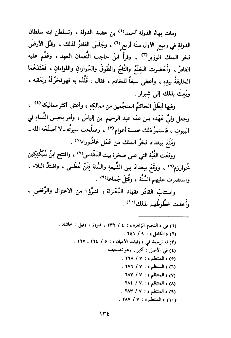 وَمَاتَ بهَاءُ الدَّوْلَة أَحْمَد (1) بن عضد الدَّوْلَة، وَتسلطن ابْنه سُلْطَان الدَّوْلَةِ فِي رَبِيْعٍ الأَوَّلِ سَنَةَ أَرْبَعٍ (2) ، وَجَلَسَ القَادِرُ لِذَلِكَ، وَقبَّل الأَرْضَ فَخر الْملك الوَزِيْر (3) ، وَقرأَ ابْنُ حَاجِب النُّعْمَان الْعَهْد، وَعَلَّم عَلَيْهِ القَادِر، وَأُحْضرت الخِلَعُ وَالتَّاجُ وَالطَّوقُ وَالسِّوَارَانِ وَاللوَاءانِ فعقدهُمَا الخَلِيْفَةُ بِيَدِهِ، وَأَعطَى سيفاً لِلْخَادم، فَقَالَ: