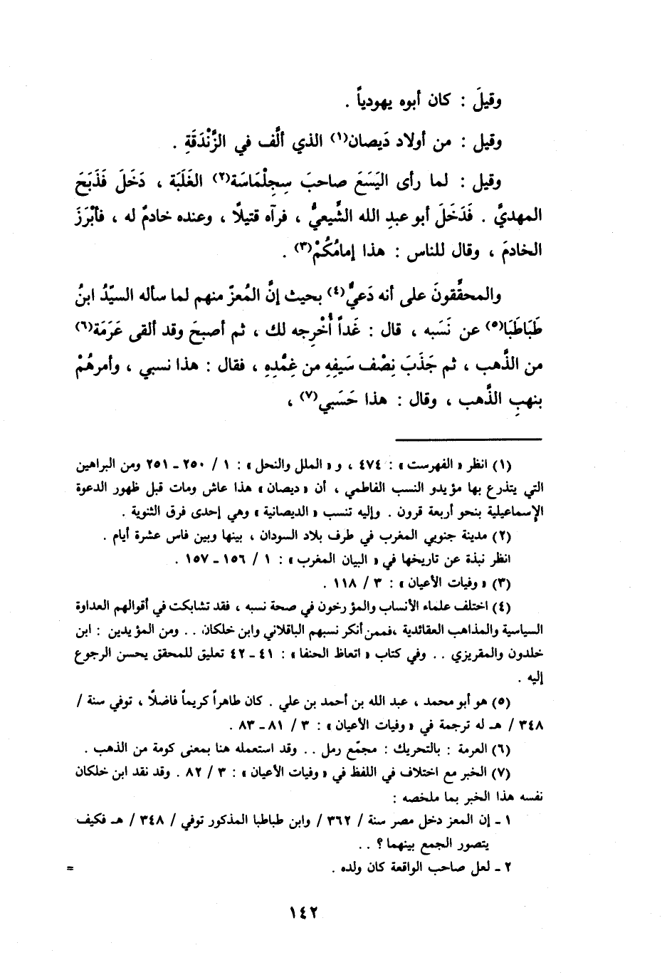 وَالمحقِّقوْنَ عَلَى أَنَّهُ دَعِيٌّ (4) بِحَيْثُ إِنَّ المُعزّ مِنْهُم لَمَّا سأَله السَّيِّدُ بنُ طَبَاطَبَا (5) عَنْ نسبه، قَالَ: