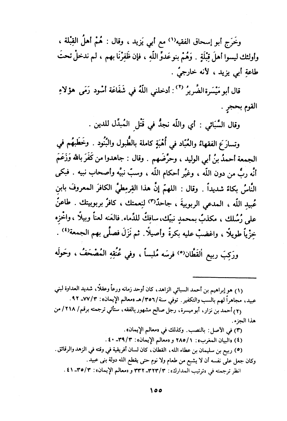 وَخَرَجَ أَبُو إِسْحَاقَ الفَقِيْه (1) مَعَ أَبِي يَزِيْد، وَقَالَ: هُم أَهْل القِبْلَة وَأَولئك ليسُوا أَهْل قبلَة وَهُم بَنو عَدُوّ الله فَإِن ظفرنَا بِهِم لَمْ ندْخل تَحْتَ طَاعَة أَبِي يَزِيْد لأَنَّه خَارِجِيّ.