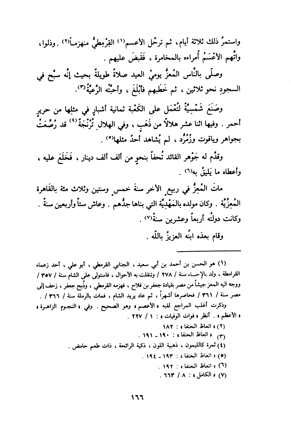 وَاسْتمرَّ ذَلِكَ ثَلاَثَة أَيَّام ثُمَّ ترحل الأَعسم (1) القرمطِي مُنْهَزِماً (2) ، وَذلُّوا وَاتهم الأَعسم أُمَرَاءهُ بِالمخَامرَة فَقبض عَلَيْهِم، وَصَلَّى بِالنَّاسِ المُعَزِّ يَوْمِي العِيْد صَلاَة طَوِيْلَة بِحَيْثُ إِنَّهُ سبح فِي السُّجُود نَحْو ثَلاَثِيْنَ ثُمَّ خطبهُم فَأَبلغ وَأَحبته الرَّعِيَّة (3) .