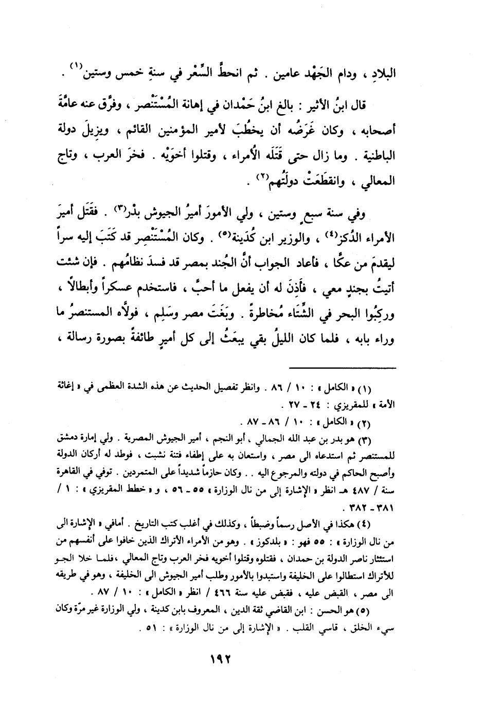 (3) هو بدر بن عبد الله الجمالي، أبو النجم، أمير الجيوش المصرية. ولي إمارة دمشق للمستنصر ثم استدعاه إلى مصر، واستعان به على إطفاء فتنة نشبت، فوطد له أركان الدولة وأصبح الحاكم في دولته والمرجوع إليه..وكان حازما شديدا على المتمردين.