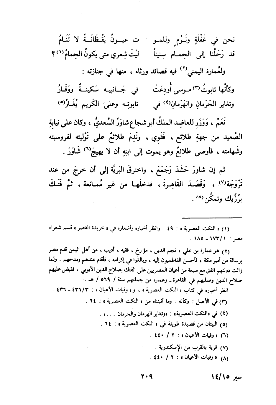 (2) هو عمارة بن علي، نجم الدين، مؤرخ، فقيه، أديب، من أهل اليمن قدم مصر برسالة من أمير مكة، فأحسن الفاطميون إليه، وبالغوا في إكرامه، فأقام عندهم ومدحهم.