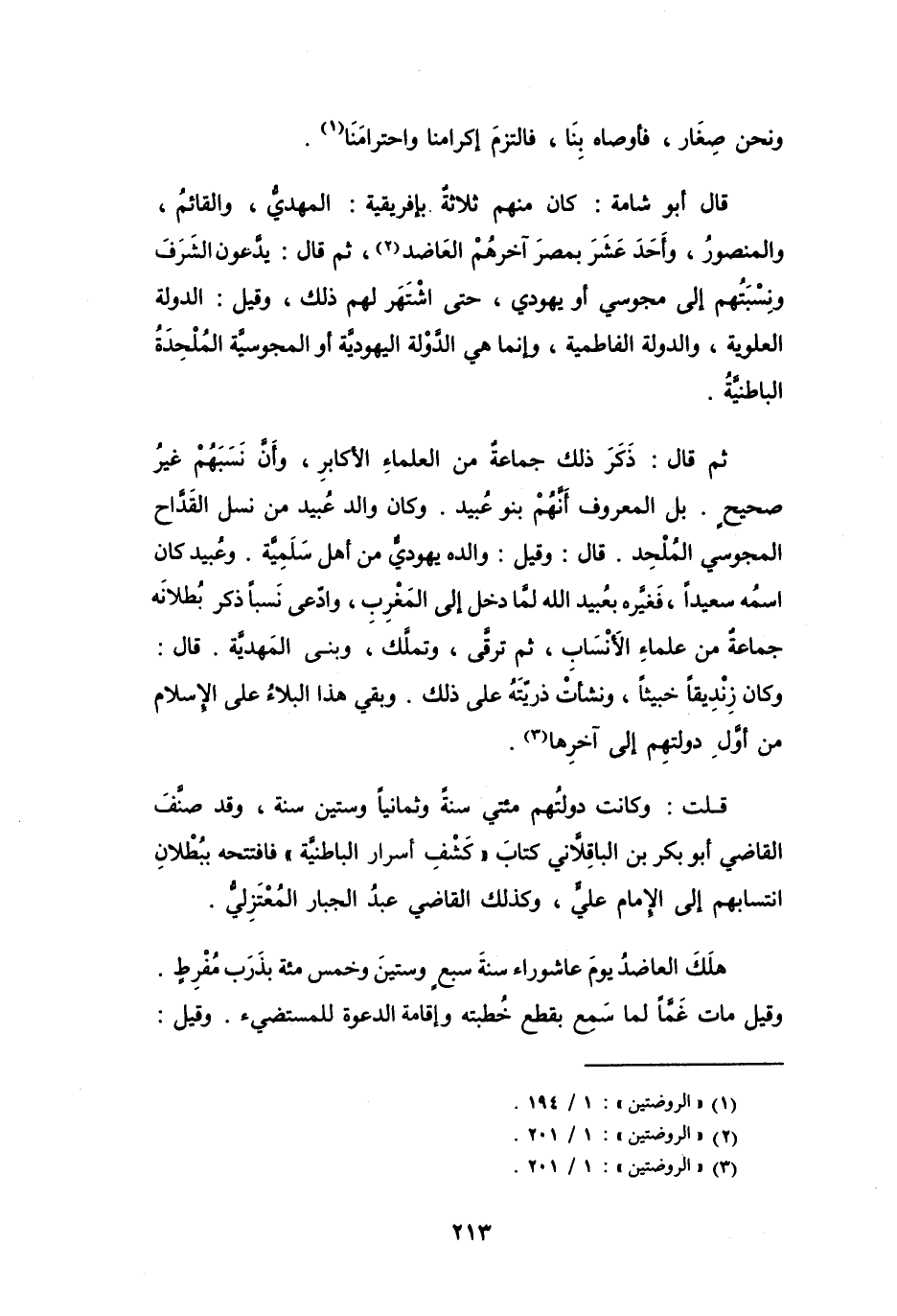 قُلْتُ: وَكَانَتْ دولتُهم مَائَتَي سنَةً وَثَمَانِياً وَسِتِّيْنَ سَنَةً، وَقَدْ صَنَّفَ القَاضِي أَبُو بَكْرٍ بنُ البَاقِلاَّنِي كتَاب (كَشْفِ أَسرَار البَاطنيَّة) فَافتتحه ببُطْلاَنِ انتسَابهِم إِلَى الإِمَام عَلِيٍّ، وَكَذَلِكَ القَاضِي عَبْدُ الجَبَّارِ المُعْتَزِلِيُّ.