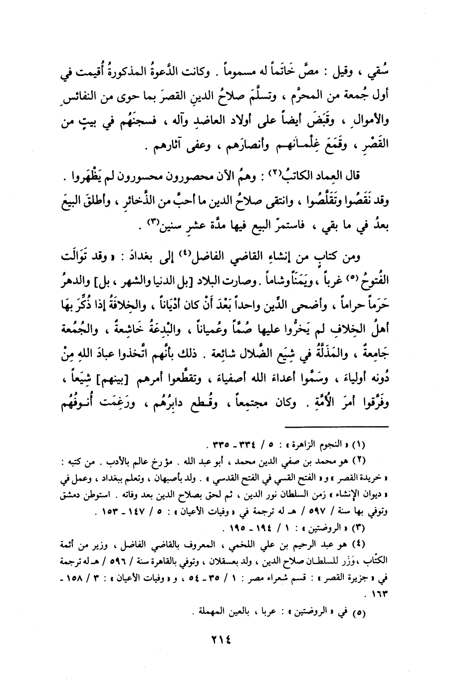 وَمِنْ كِتَابٍ مِنْ إِنشَاءِ القَاضِي الفَاضِل (4) إِلَى بَغْدَادَ: وَقَدْ تَوَالَتِ الفُتوحُ (5) غرباً، وَيَمَناً وَشَاماً، وَصَارت البِلاَد - بَلِ الدُّنْيَا وَالشهر، بَلْ وَالدَّهْرُ - حَرَماً حرَاماً، وَأَضحَى الدِّين وَاحِداً بَعْدَ أَنْ كَانَ أَدْيَاناً، وَالخِلاَفَةُ إِذَا ذُكِّرَ بِهَا أَهْلُ الخِلاَفِ لَمْ يَخُّرُوا عَلَيْهَا صُمّاً وَعُمِيَاناً، وَالبِدْعَةُ خَاشِعَة، وَالجُمُعَة جَامِعَة، وَالمَذَلَّةُ فِي شِيَعِ الضَّلاَل شَائِعَة.