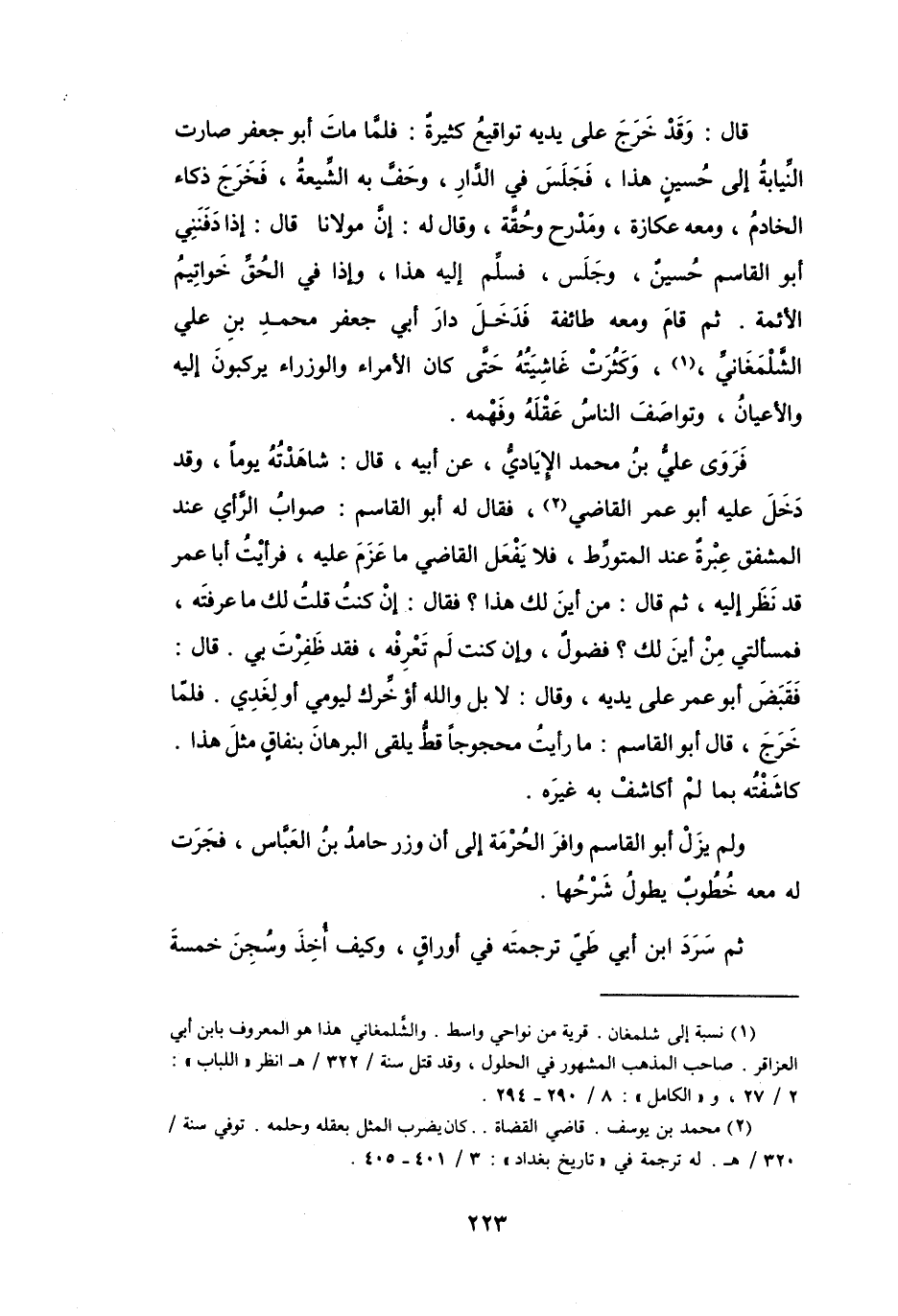 ثُمَّ قَامَ وَمَعَهُ طَائِفَة فَدَخَلَ دَارَ أَبِي جَعْفَرٍ مُحَمَّدِ بنِ عَلِيٍّ الشَّلْمَغَانِيِّ (2) ، وَكَثُرَتْ غَاشِيَتُهُ حَتَّى كَانَ الأُمَرَاء وَالوزرَاء يَرْكَبُوْنَ إِلَيْهِ وَالأَعيَانُ، وَتوَاصَفَ النَّاسُ عَقْلَهُ وَفَهْمه.
