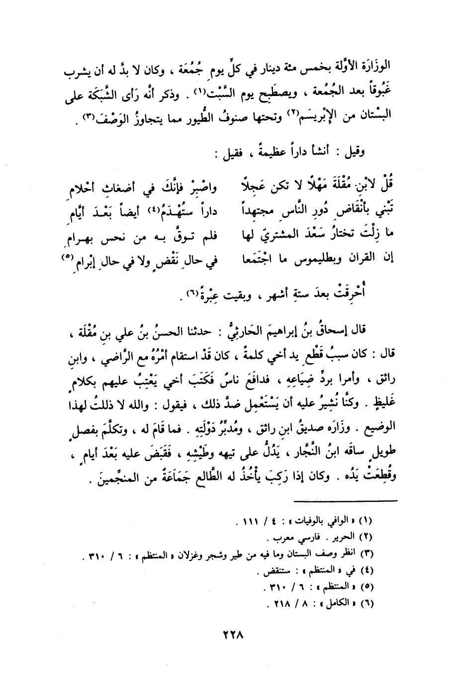 (3) انظر وصف البستان وما فيه من طير وشجر وغزلان " المنتظم ": 6 / 310.
