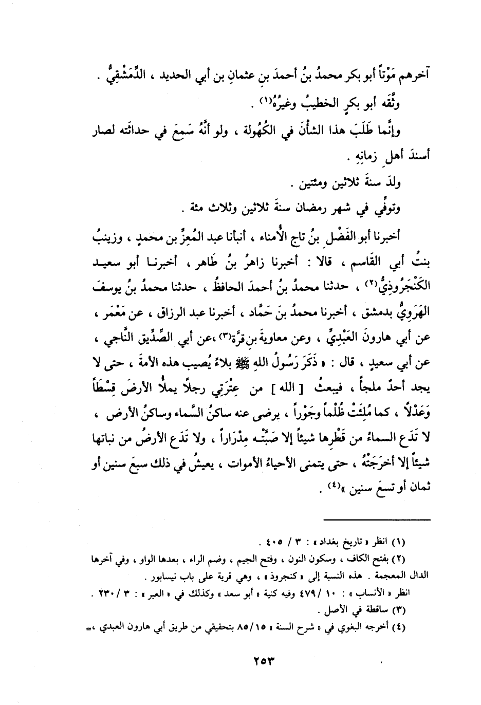 أَخْبَرَنَا زَاهِرُ بنُ طَاهِرٍ، أَخْبَرَنَا أَبُو سَعِيْدٍ الكَنْجَرُوْذِيّ (2) ، حَدَّثَنَا مُحَمَّدُ بنُ أَحْمَدَ الحَافِظُ، حَدَّثَنَا مُحَمَّدُ بنُ يُوْسُفَ الهَرَوِيّ بِدِمَشْقَ، أَخْبَرَنَا مُحَمَّدُ بنُ حَمَّاد، أَخْبَرَنَا عَبْدُ الرَّزَّاق، عَنْ مَعْمَر، عَنْ أَبِي هَارُوْنَ العَبْدِيّ، وَعَنْ مُعَاوِيَةَ بن قرَّة (3) ، عَنْ أَبِي الصِّدِّيق النَّاجِيّ، عَنْ أَبِي سَعِيْدٍ قَالَ: (ذكر رَسُوْل اللهِ - صَلَّى اللَّهُ عَلَيْهِ وَسَلَّمَ - بلاَءً يُصِيب هَذِهِ الأُمَّة حَتَّى لاَ يجد أَحَد ملجأً فَيبْعَث الله مِنْ عترتِي رَجُلاً يملأُ الأَرْض قسطاً وَعدلاً كَمَا مُلئت ظلماً وَجوراً، يَرْضَى عَنْهُ سَاكن السَّمَاء وَسَاكن الأَرْض، لاَ تدع السَّمَاء مِنْ قطرهَا شَيْئاً إِلاَّ صَبَّتْهُ مدرَاراً، وَلاَ تدع الأَرْض مِنْ نبَاتهَا شَيْئاً إِلاَّ أَخرجته، حَتَّى يَتَمَنَّى الأَحيَاء الأَموَاتَ يعِيش فِي ذَلِكَ سَبْع سِنِيْنَ أَوْ ثَمَان أَوْ تِسْع سِنِيْنَ) (4) .
