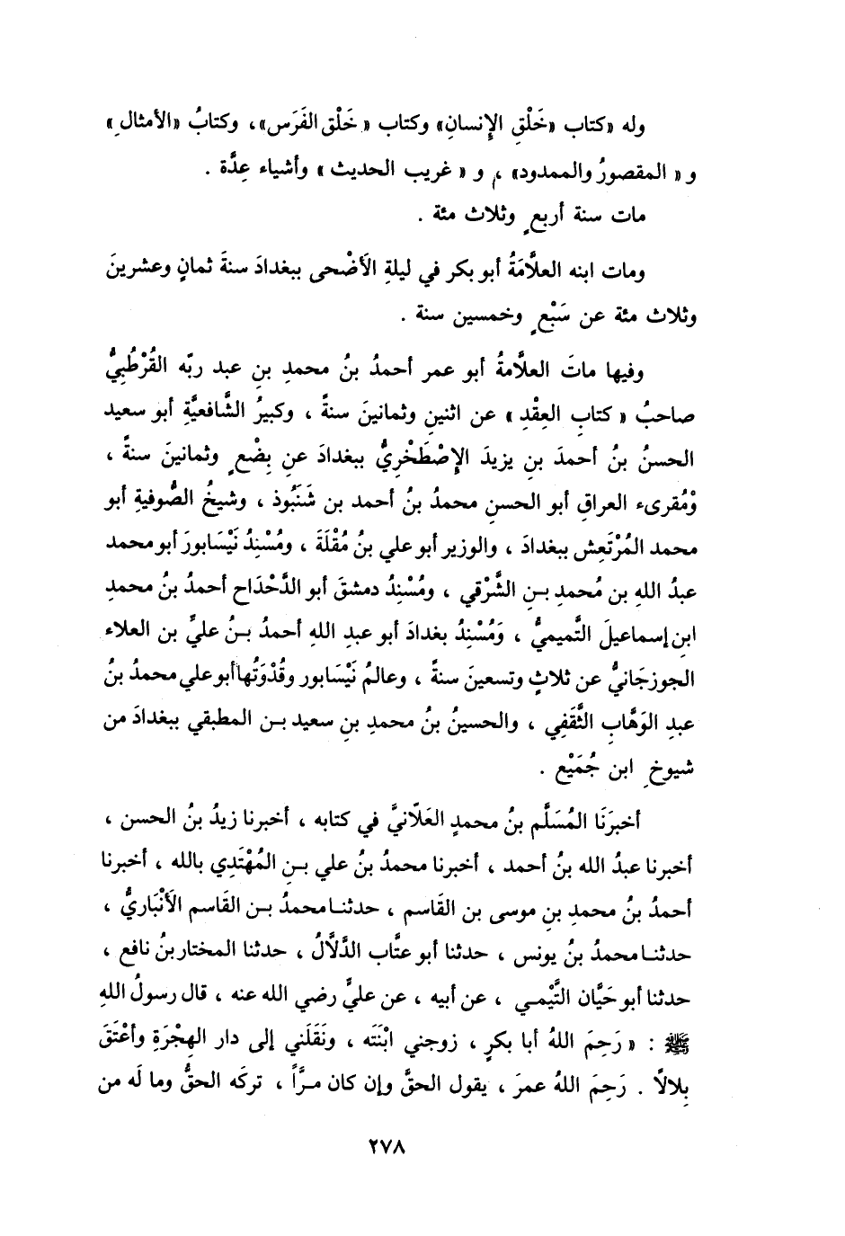 قَالَ رَسُوْلُ اللهِ - صَلَّى اللَّهُ عَلَيْهِ وَسَلَّمَ -: (رَحِمَ اللهُ أَبَا بَكْرٍ، زوجنِي ابْنَتَه، وَنَقَلَنِي إِلَى دَار الهِجْرَةِ وَأَعْتَقَ بِلالاً، رَحِمَ اللهُ عُمَرَ يَقُوْلُ الحَقَّ وَإِنْ كَانَ مرّاً، تركَه الحَقُّ وَمَا لَهُ مِنْ
