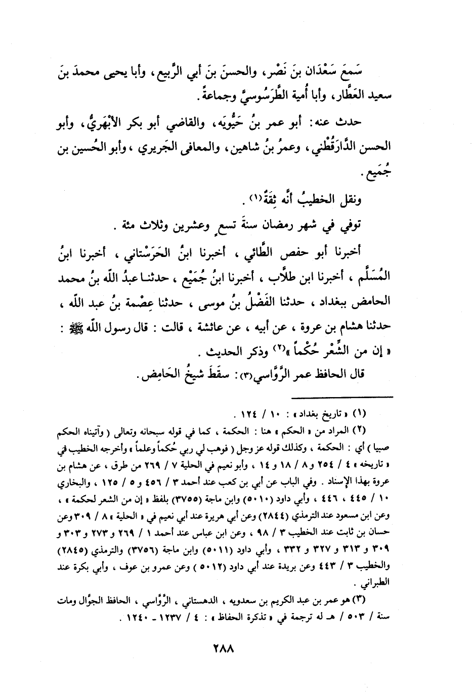 (3) هو عمر بن عبد الكريم بن سعدويه، الدهستاني، الرواسي، الحافظ الجوال ومات سنة / 503 / هـ له ترجمة في " تذكرة الحفاظ ": 4 / 1237 - 1240.