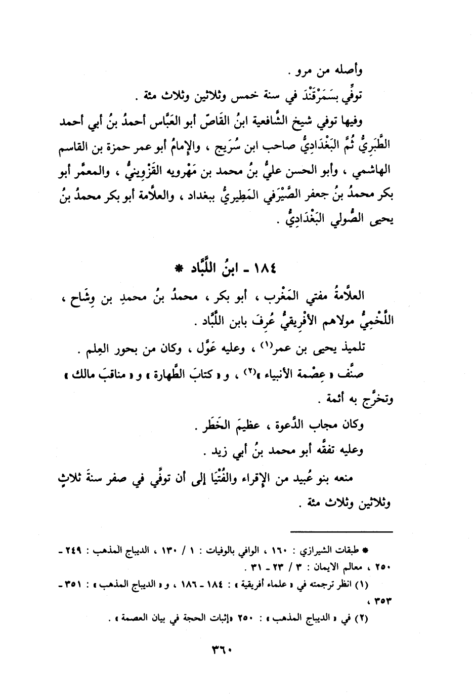 (1) انظر ترجمته في " علماء أفريقية ": 184 - 186، و" الديباج المذهب ": 351 - 353، (2) في " الديباج المذهب ": 250 " إثبات الحجة في بيان العصمة ".