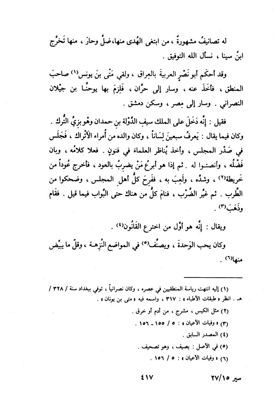 (1) إليه انتهت رياسة المنطقيين في عصره، وكان نصرانيا، توفي ببغداد سنة / 328 / هـ. انظر " طبقات الاطباء ": 317، واسمه فيه " متى بن يونان ".