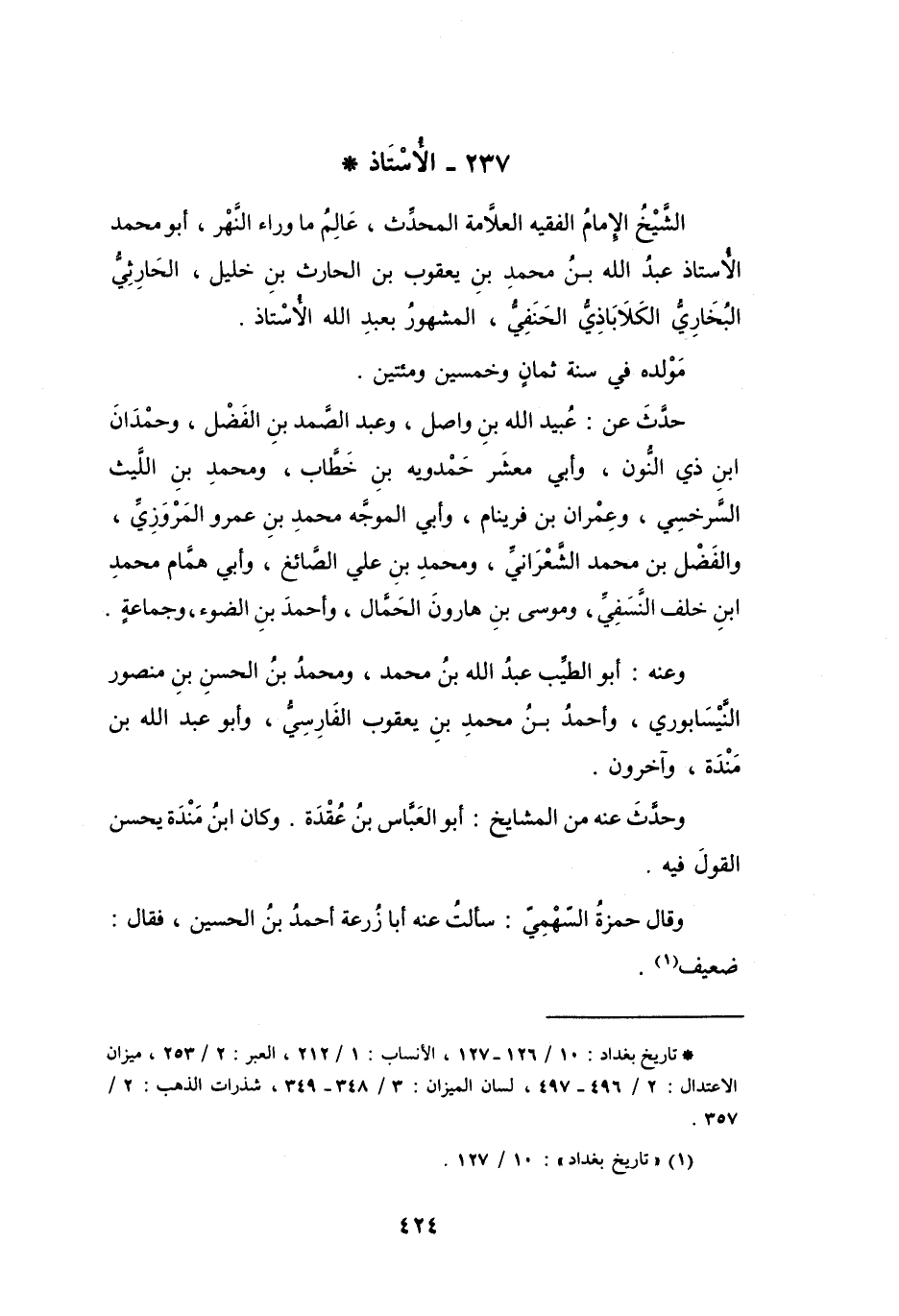 الشَّيْخُ، الإِمَامُ، الفَقِيْه، العَلاَّمَة، المُحَدِّث، عَالِمُ مَا وَرَاء النَّهْر، أَبُو مُحَمَّدٍ الأُسْتَاذ عَبْدُ اللهِ بنُ مُحَمَّدِ بنِ يَعْقُوْبَ بنِ الحَارِثِ بنِ خَلِيْلٍ الحَارِثِيُّ، البُخَارِيُّ، الكَلاَبَاذِيُّ، الحَنَفِيُّ، المَشْهُورُ: بِعَبْدِ اللهِ الأُسْتَاذِ.