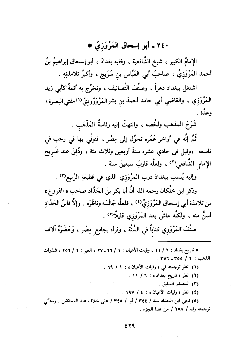 الإِمَامُ الكَبِيْر، شَيْخ الشَّافِعِيَّة، وَفَقِيْه بَغْدَادَ، أَبُو إِسْحَاقَ إِبْرَاهِيْمُ بنُ أَحْمَدَ المَرْوَزِيُّ، صَاحِبُ أَبِي العَبَّاسِ بنِ سُرَيْجٍ، وَأَكْبَرُ تَلاَمِذتِهِ.