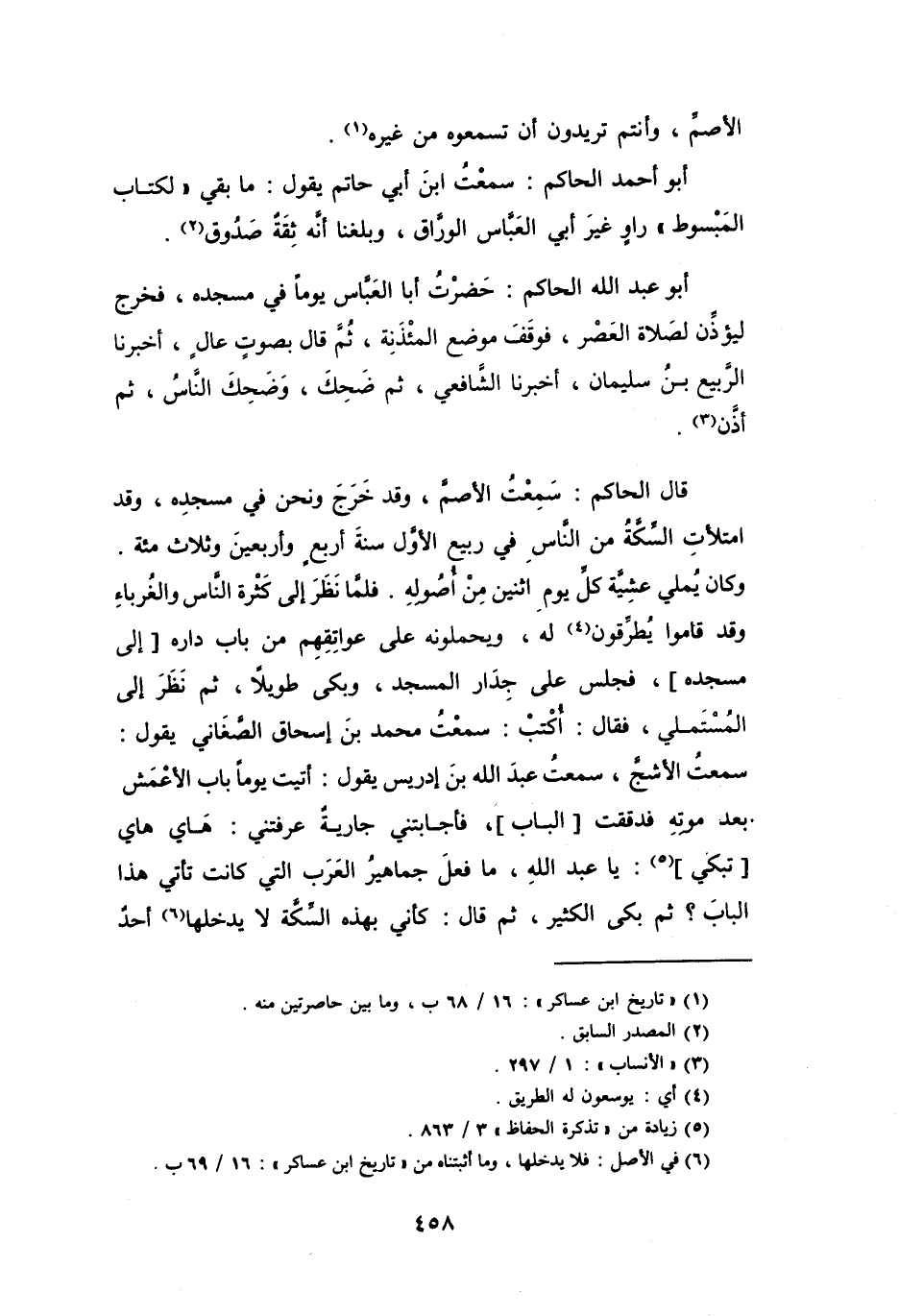 قَالَ الحَاكِمُ: سَمِعْتُ الأَصَمّ، وَقَدْ خَرَجَ وَنَحْنُ فِي مسجدِه، وَقَدِ امتلأَتِ السِّكَّةُ مِنَ النَّاسِ فِي رَبِيْعٍ الأَوَّلِ سَنَةَ أَرْبَعٍ وَأَرْبَعِيْنَ وَثَلاَثِ مائَةٍ.