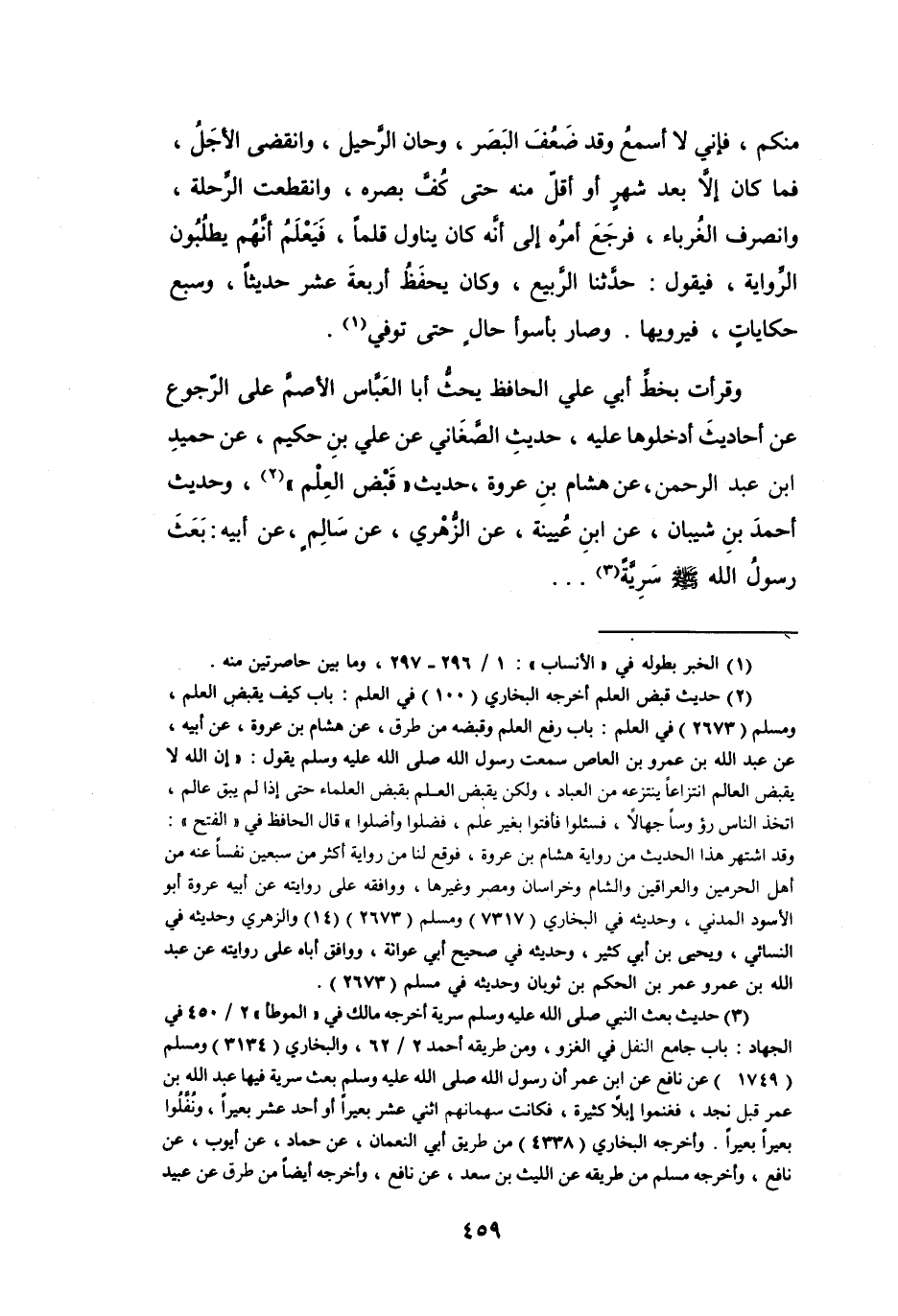 وقَرَأْت بخطِّ أَبِي عَلِيٍّ الحَافِظ يحثُّ أَبَا العَبَّاسِ الأَصَمَّ عَلَى الرُّجُوع عَنْ أَحَادِيْثَ أَدخلوهَا عَلَيْهِ، حَدِيْثِ الصَّغَانِيّ، عَنْ عَلِيِّ بنِ حَكِيْم، عَنْ حُمَيْدِ بنِ عَبْدِ الرَّحْمَنِ، عَنْ هِشَامِ بنِ عُرْوَةَ، حَدِيْث (قَبْض العِلْم (2)) ، وَحَدِيْث أَحْمَدَ بنِ شَيْبَان، عَنِ ابْنِ عُيَيْنَة، عَنِ الزُّهْرِيِّ، عَنْ سَالِمٍ، عَنْ أَبِيهِ: