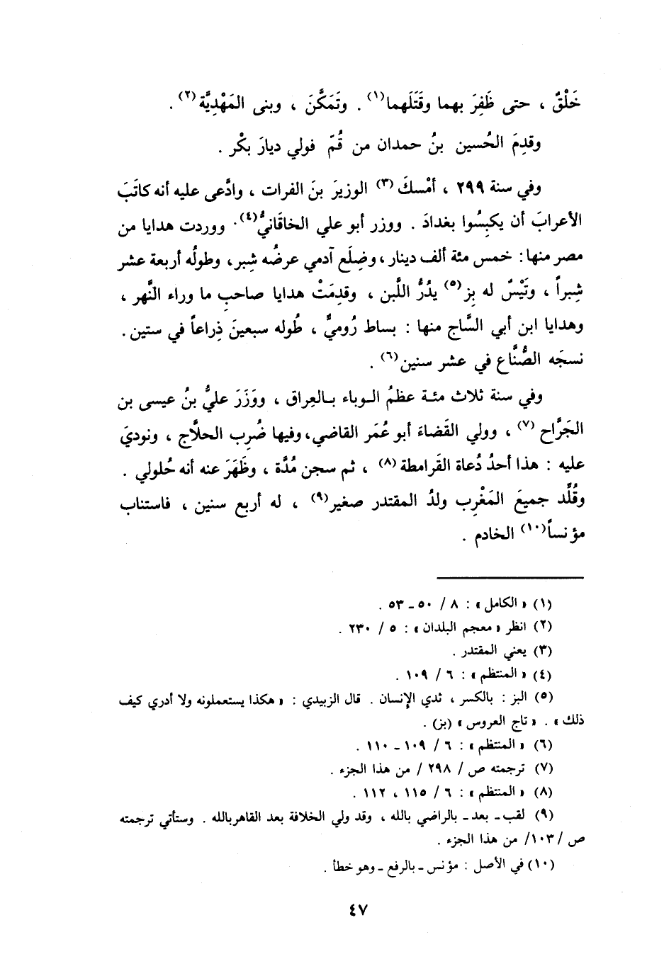 (9) لقب - بعد - بالراضي بالله، وقد ولي الخلافة بعد القاهر بالله. وستأتي ترجمته ص / 103 / من هذا الجزء.