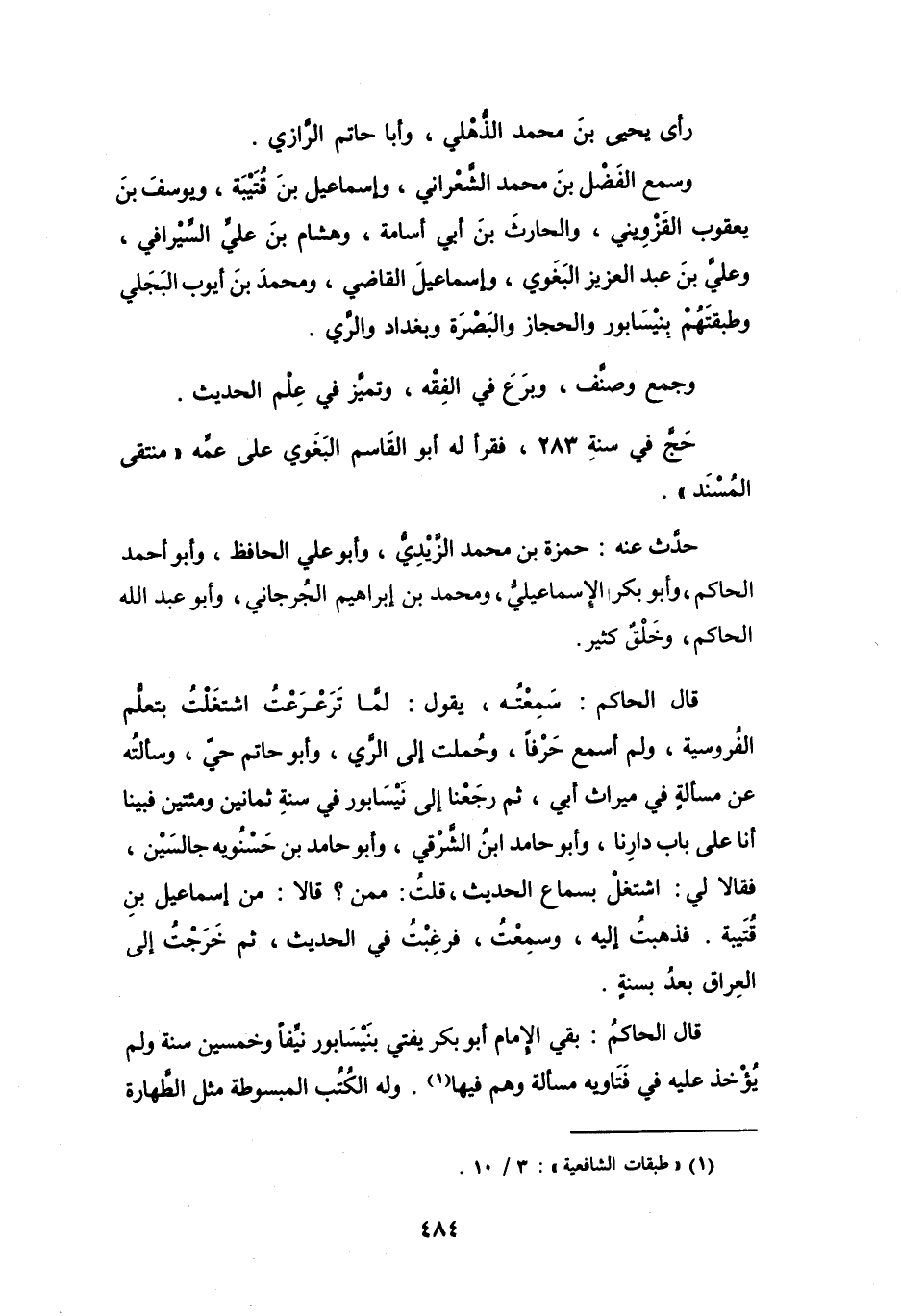 قَالَ الحَاكِمُ: سَمِعْتُهُ يَقُوْلُ: لمَّا تَرَعْرَعْتُ اشتغَلْتُ بتعلُّم الفُروسيَّة، وَلَمْ أَسْمَعْ حَرْفاً، وَحُملت إِلَى الرَّيّ، وَأَبُو حَاتِمٍ حَيّ، وَسأَلتُه عَنْ مَسْأَلَةٍ فِي مِيرَاث أَبِي، ثُمَّ رجَعْنَا إِلَى نَيْسَابُوْرَ فِي سَنَةِ ثَمَانِيْنَ وَمائَتَيْنِ فَبَيْنَا أَنَا عَلَى بَاب دَارِنَا، وَأَبُو حَامِد بنُ الشَّرْقِيّ، وَأَبُو حَامِد بن حَسْنُويه جَالسَيْن، فَقَالاَ لِي: اشتغلْ بسَمَاع الحَدِيْث.