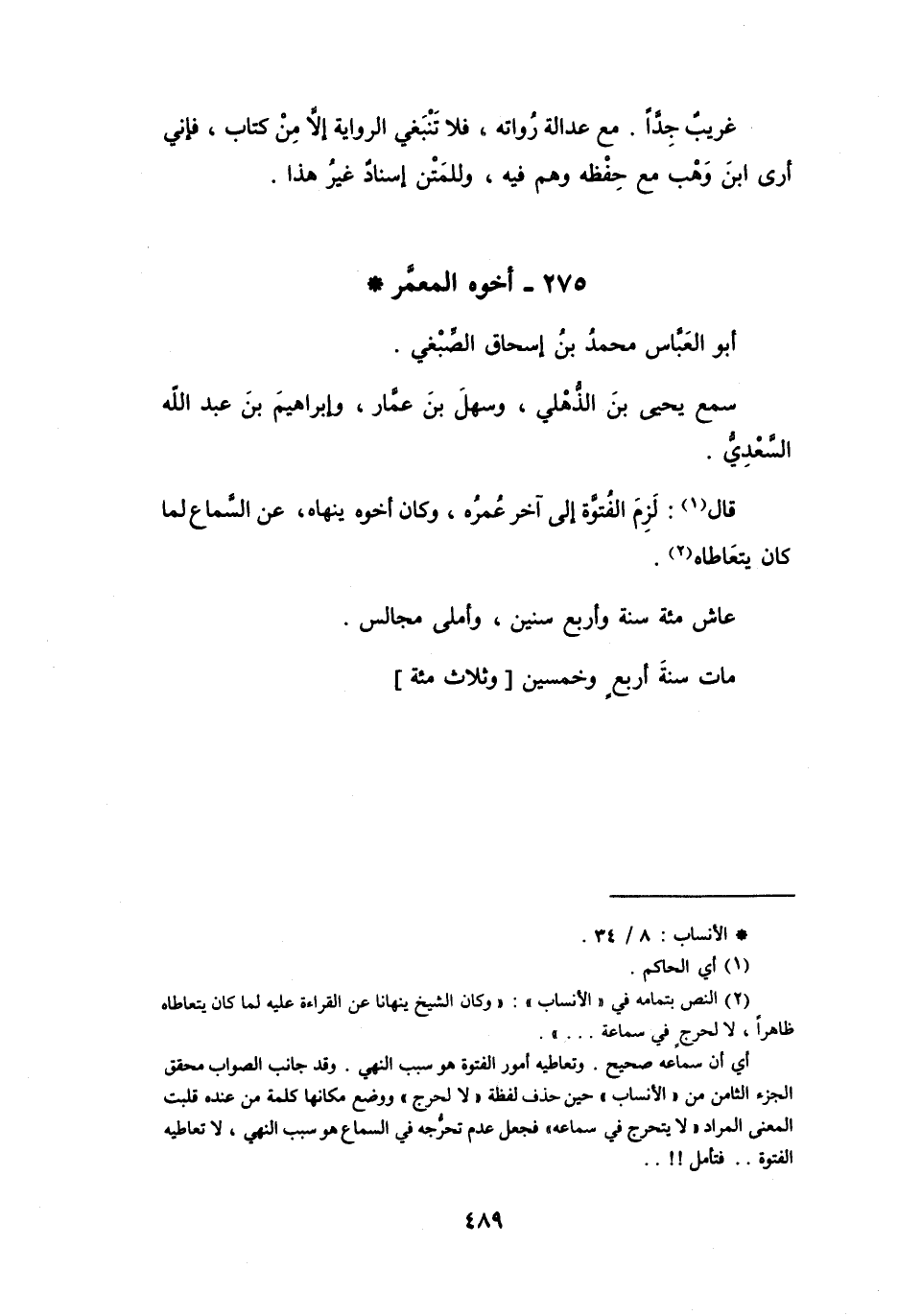 وتعاطيه أمور الفتوة هو سبب النهي، وقد جانب الصواب محقق الجزء الثامن من " الأنساب " حين حذف لفظة " لا لحرج " ووضع مكانها كلمة من عنده قلبت المعنى المراد " لا يتحرج في سماعه " فجعل عدم تحرجه في السماع هو سبب النهي، لا تعاطيه الفتوة..فتأمل!..