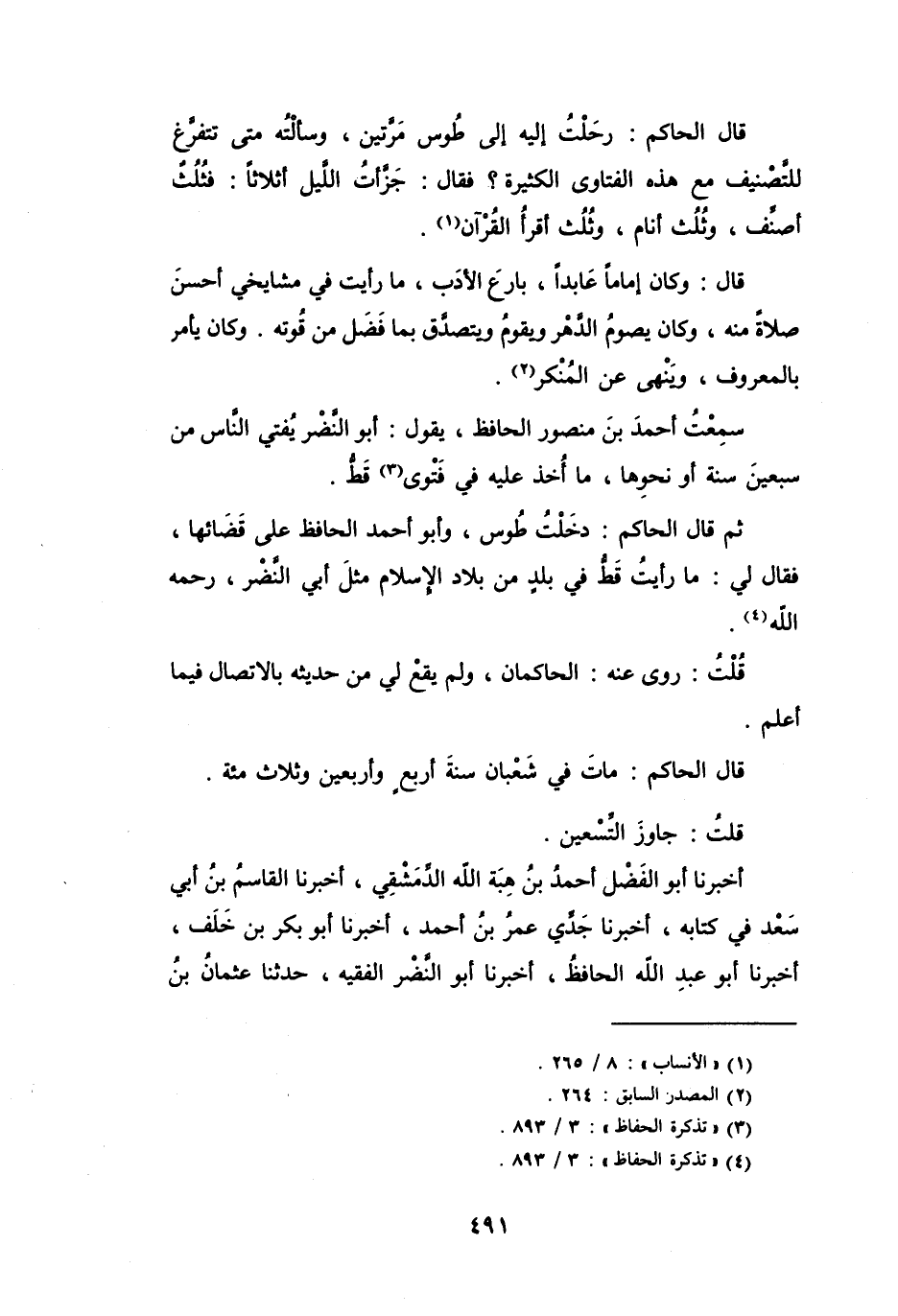 ثُمَّ قَالَ الحَاكِمُ: دَخَلْتُ طُوْس، وَأَبُو أَحْمَدَ الحَافِظ عَلَى قَضَائِهَا، فَقَالَ لِي: مَا رَأَيْتُ قَطُّ فِي بلدٍ مِنْ بلاَد الإِسْلاَم مِثْل أَبِي النَّضْرِ - رَحِمَهُ اللهُ (4) -.