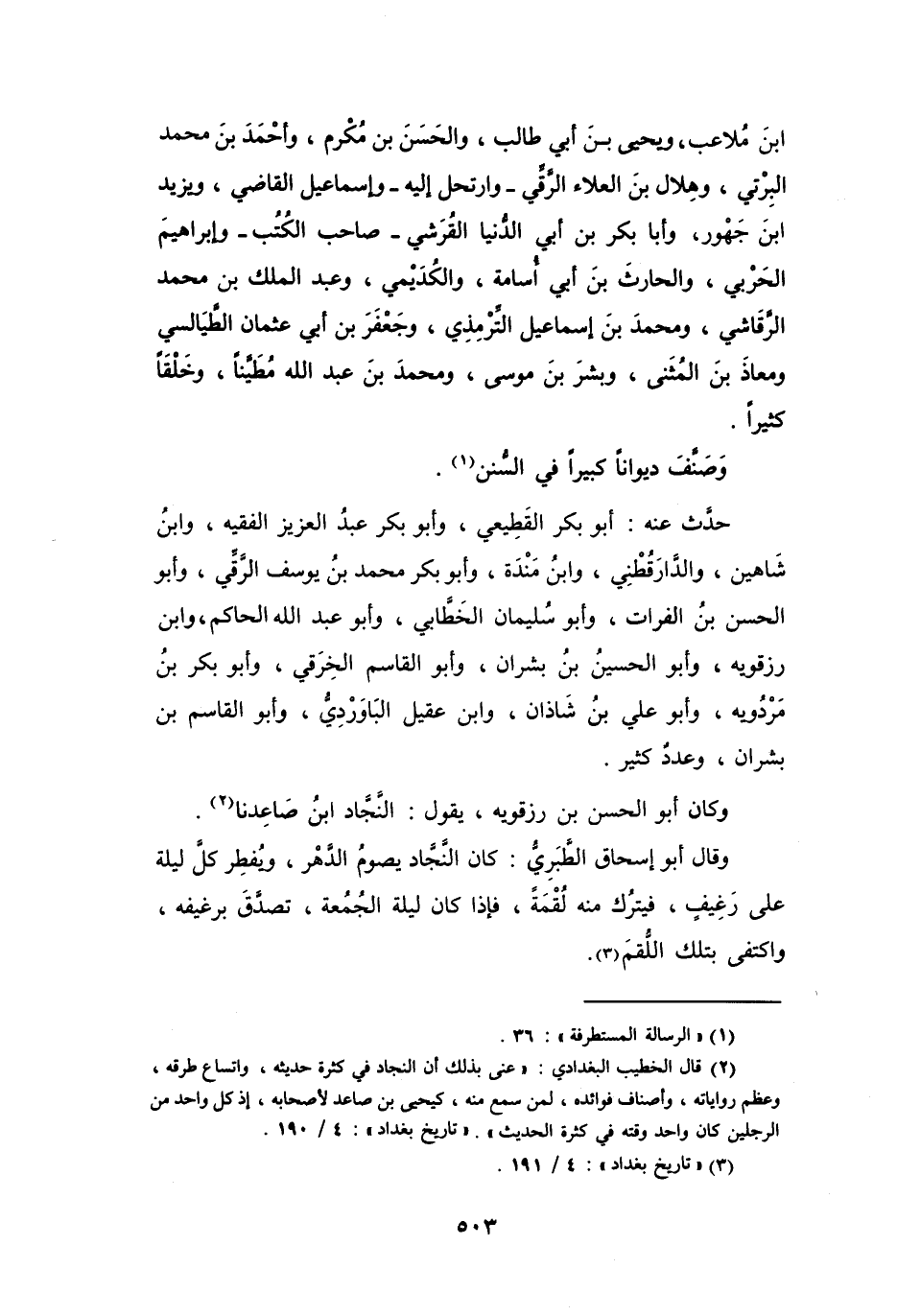 (2) قال الخطيب البغدادي: " عنى بذلك أن النجاد في كثرة حديثه، واتساع طرقه، وعظم رواياته، وأصناف فوائده، لمن سمع منه، كيحيى بن صاعد لأصحابه، إذ كل واحد من الرجلين كان واحد وقته في كثرة الحديث ". " تاريخ بغداد ": 4 / 190.