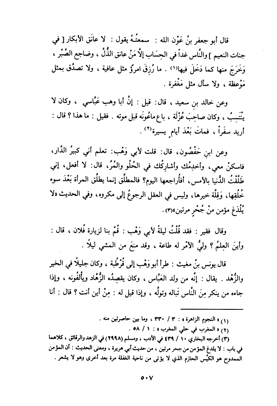 وَعَنْ خَالِدِ بنِ سَعِيْدٍ، قَالَ: قِيْلَ: إِنَّ أَبَا وَهب عَبَّاسِي، وَكَانَ لاَ يَنْتَسِبُ، وَكَانَ صَاحِبَ عُزْلَة، بَاعَ مَاعُونَه قَبْل مَوْته، فَقِيْلَ: مَا هَذَا؟
