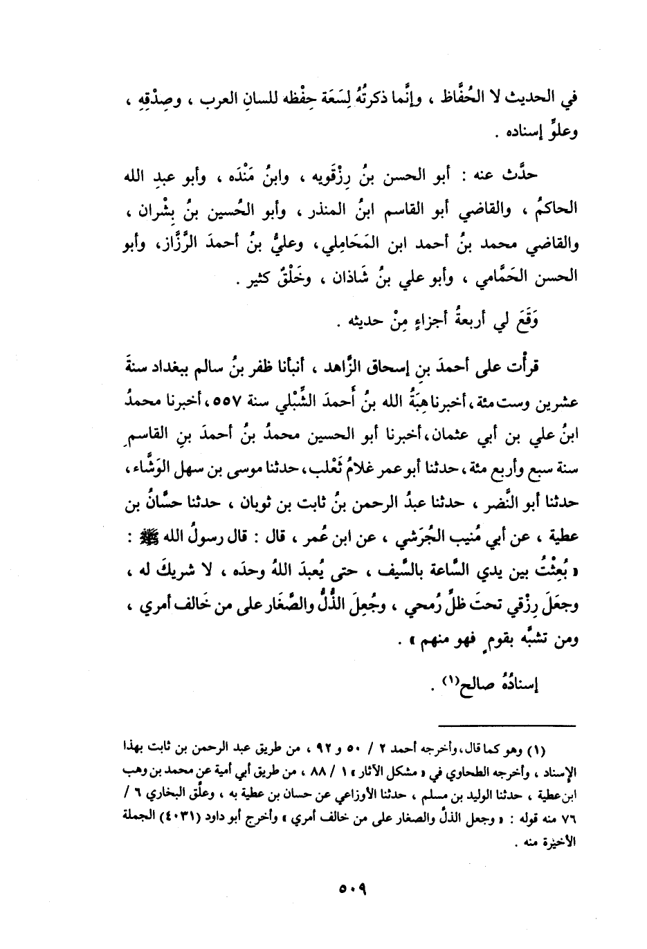 قَرَأْتُ عَلَى أَحْمَدَ بنِ إِسْحَاقَ الزَّاهِد، أَنْبَأَنَا ظفر بنُ سَالِم بِبَغْدَادَ سنَةَ عِشْرِيْنَ وَسِت مائَة، أَخْبَرَنَا هِبَةُ اللهِ بنُ أَحْمَدَ الشِّبْلِي سنَة 557، أَخْبَرَنَا مُحَمَّدُ بنُ عَلِيِّ بنِ أَبِي عُثْمَانَ، أَخْبَرَنَا أَبُو الحُسَيْنِ مُحَمَّدُ بنُ أَحْمَدَ بنِ القَاسِمِ سَنَةَ سَبْعٍ وَأَرْبَعِ مائَةٍ، حَدَّثَنَا أَبُو عُمَرَ غُلاَمُ ثَعْلب، حَدَّثَنَا مُوْسَى بنُ سَهْل الوَشَّاء، حَدَّثَنَا أَبُو النَّضْر، حَدَّثَنَا عَبْدُ الرَّحْمَنِ بنُ ثَابِت بن ثَوْبَان، حَدَّثَنَا حَسَّانُ بنُ عَطِيَّةَ، عَنْ أَبِي مُنيب الجُرَشِيّ، عَنِ ابْنِ عُمَرَ، قَالَ: