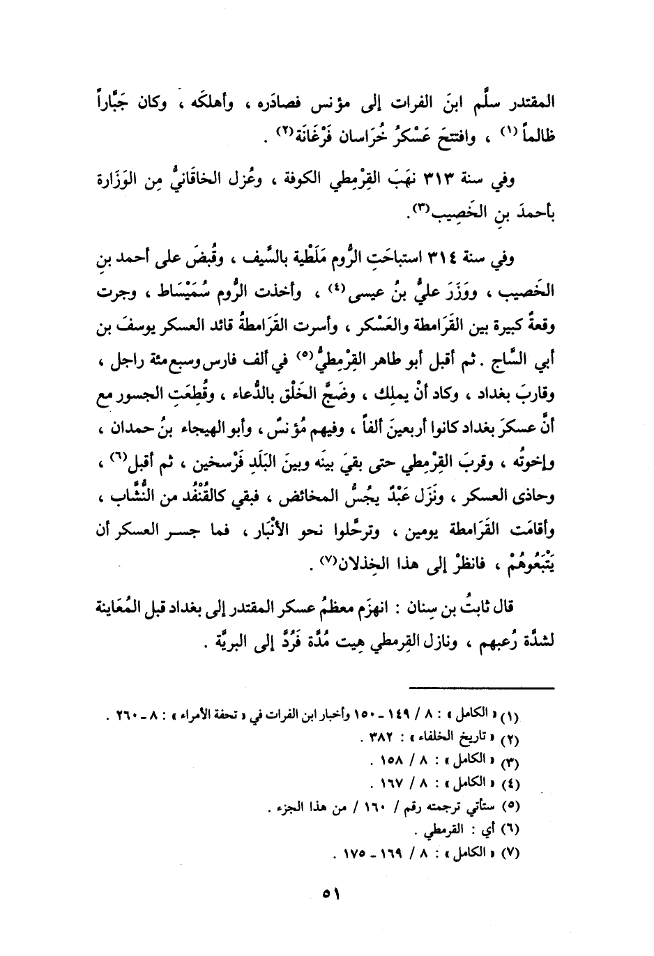 (1) " الكامل ": 8 / 149 - 150 وأخبار ابن الفرات في " تحفة الامراء ": 8 - 260.