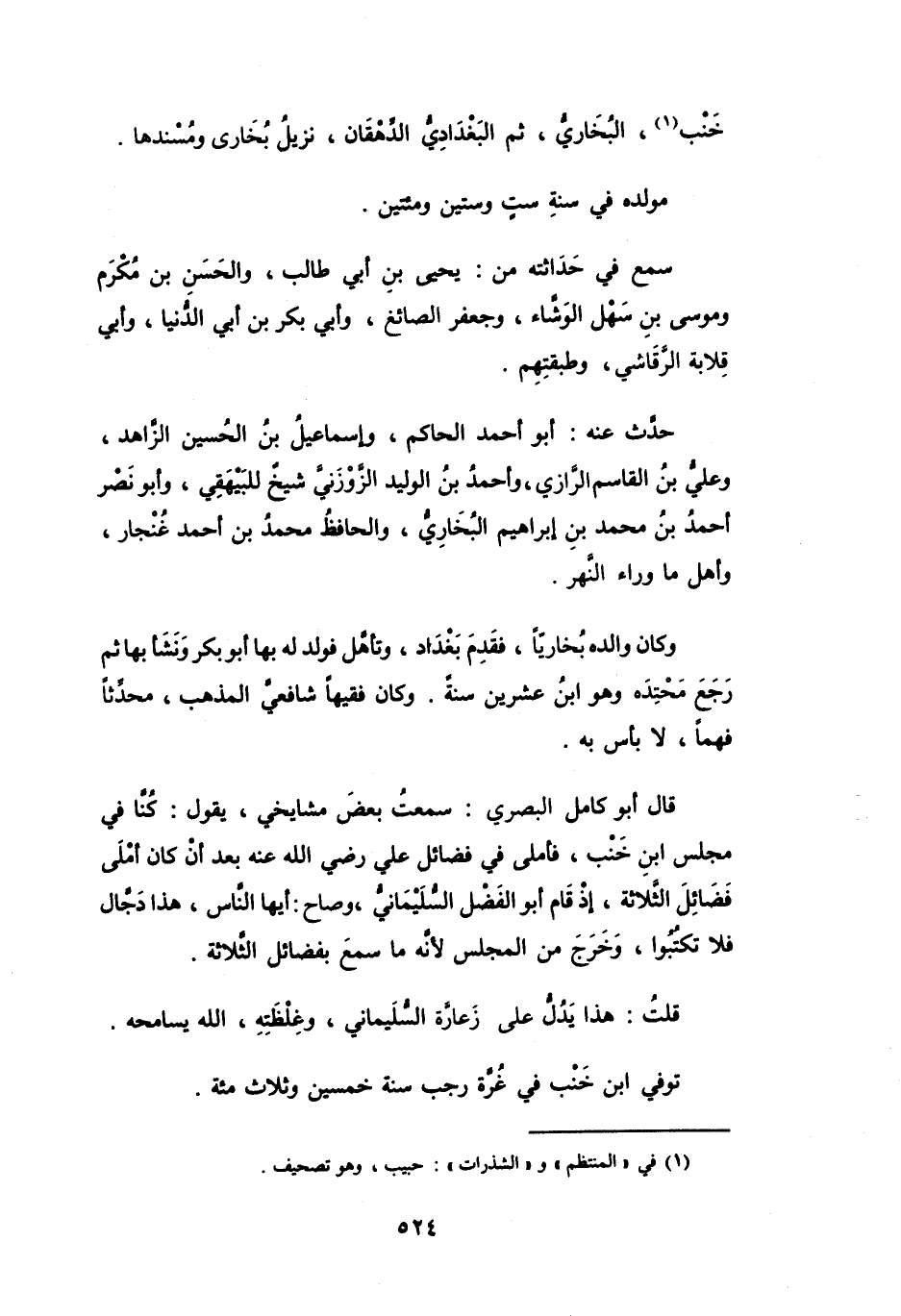 كُنَّا فِي مَجْلِس ابْنِ خَنْب، فَأَملَى فِي فَضَائِل عليّ - رَضِيَ اللهُ عَنْهُ - بَعْدَ أَنْ كَانَ أَمْلَى فَضَائِلَ الثَّلاَثَة، إِذْ قَامَ أَبُو الفَضْلِ السُّلَيْمَانِيُّ، وَصَاح: