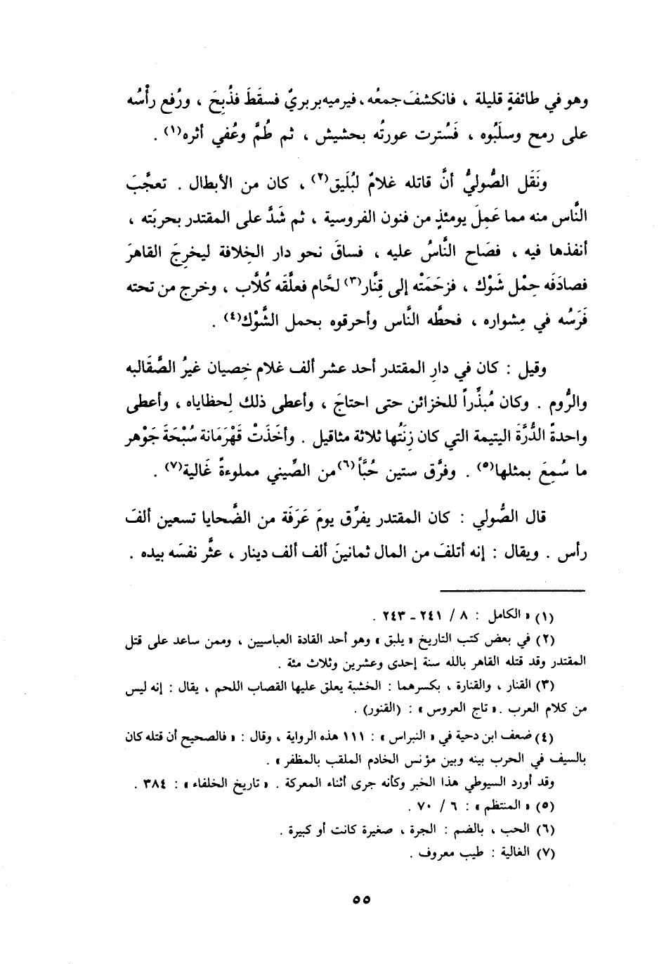 (4) ضعف ابن دحية في " النبراس ": 111 هذه الرواية، وقال: " فالصحيح أن قتله كان بالسيف في الحرب بينه وبين مؤنس الخادم الملقب بالمظفر ". وقد أورد السيوطي هذا الخبر وكأنه جرى أثناء المعركة. " تاريخ الخلفاء ": 384.