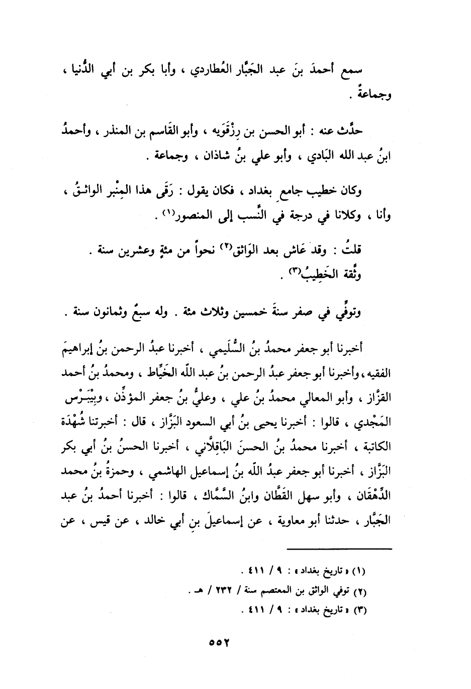 أَخْبَرَتْنَا شُهْدَةُ الكَاتِبَةُ، أَخْبَرَنَا مُحَمَّدُ بنُ الحَسَنِ البَاقلاَنِي، أَخْبَرَنَا الحَسَنُ بنُ بَكْرٍ البَزَّاز، أَخْبَرَنَا أَبُو جَعْفَرٍ عَبْدُ اللهِ بنُ إِسْمَاعِيْلَ الهَاشِمِيّ، وَحَمْزَةُ بنُ مُحَمَّدٍ الدِّهْقَان، وَأَبُو سَهْلٍ القَطَّان وَابْنُ السَّمَّاكِ قَالُوا: