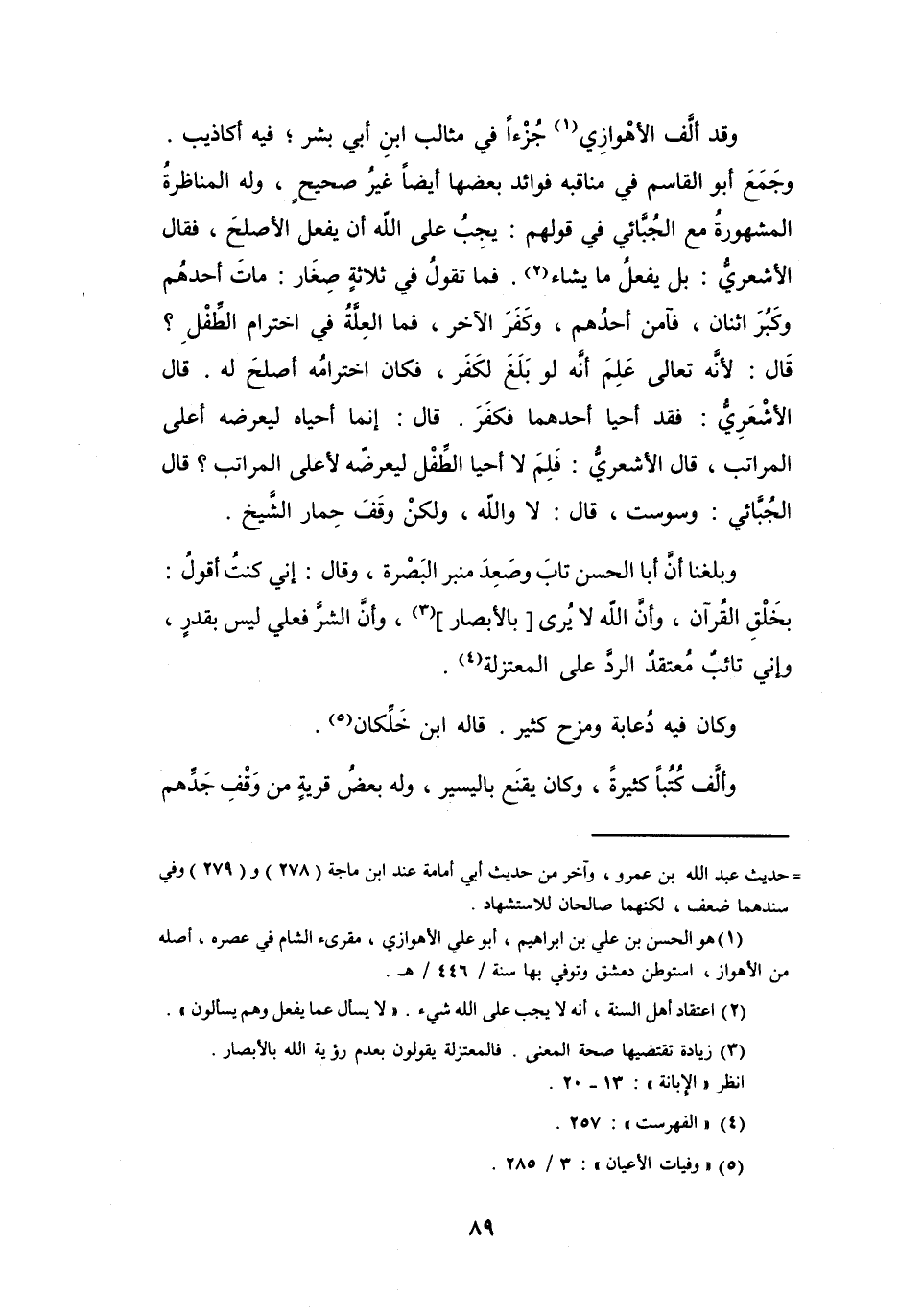 وَجَمَعَ أَبُو القَاسِمِ فِي مَنَاقِبه فَوَائِد بَعْضهَا أَيْضاً غَيْرُ صَحِيْحٍ، وَلَهُ المُنَاظَرَةُ المَشْهُوْرَةُ مَعَ الجُبَّائِي فِي قَوْلِهِم: يَجِبُ عَلَى اللهِ أَنْ يَفْعَل الأَصلحَ، فَقَالَ الأَشْعَرِيُّ: بَلْ يَفْعَلُ مَا يشَاء (2) ، فَمَا تَقُولُ فِي ثَلاَثَةٍ صِغَار: مَاتَ أَحَدهُم وَكَبُرَ اثْنَانِ، فَآمن أَحَدُهُم، وَكَفَرَ الآخر، فَمَا العِلَّةُ فِي اخترَام الطِّفْلِ؟