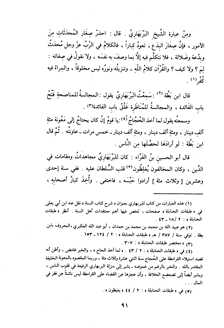 (1) هذه العبارات من كتاب للبربهاري بعنوان " شرح كتاب السنة " نقل عنه ابن أبي يعلى في " طبقات الحنابلة " صفحات، لخص فيها أهم معتقدات أهل السنة. أنظر " طبقات " الحنابلة ": 2 / 18 - 43.