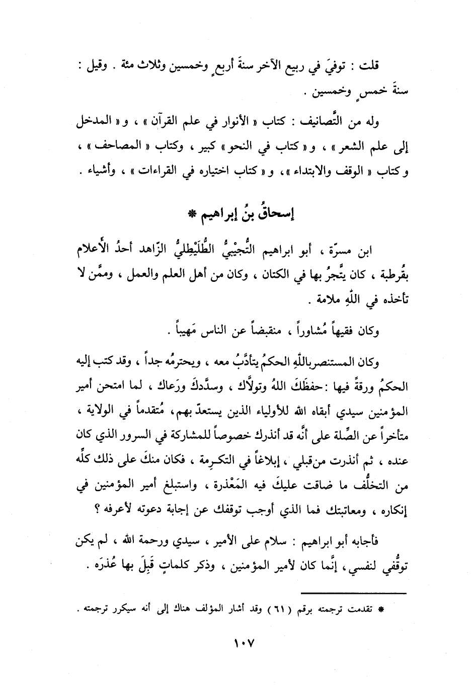 فَأَجَابَ أَبُو إِبْرَاهِيْمَ: سلاَمٌ عَلَى الأَمِيْرِ، سيِّدي وَرَحْمَةُ اللهِ، لَمْ يَكُنْ توقُّفي لنفسِي، إِنَّمَا كَانَ لأَمِيْرِ المُؤْمِنِيْنَ، وَذكرَ كلمَاتٍ قَبِلَ بِهَا عُذرَهُ.