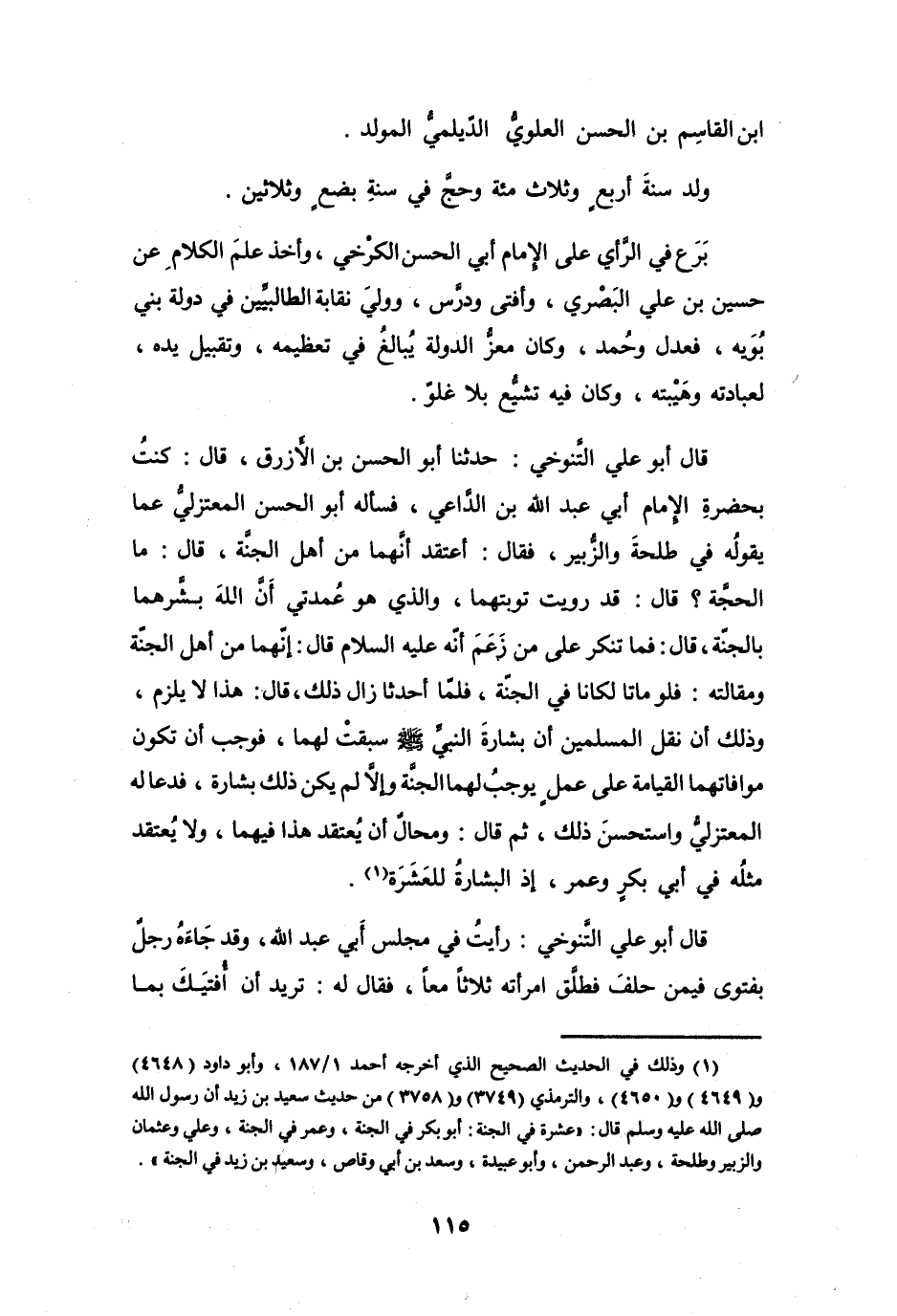 قَالَ: هَذَا لاَ يلزمُ، وَذَلِكَ أَنَّ نقلَ المُسْلِمِينَ أَنَّ بِشَارَةَ النَّبِيِّ - صَلَّى اللَّهُ عَلَيْهِ وَسَلَّمَ - سبقتْ لَهُمَا، فَوجبَ أَنْ تكُونَ موَافَاتُهُمَا القِيَامَة علَى عملٍ يوجبُ لَهُمَا الجَنَّةَ، وَإِلاَّ لَمْ يَكُنْ ذَلِكَ بِشَارَةً، فدعَا لهُ المُعْتَزلِيُّ وَاسْتحسنَ ذَلِكَ، ثُمَّ قَالَ: وَمحَالٌ أَنْ يُعتقدَ هَذَا فِيْهِمَا، وَلاَ يُعتقد مثلُهُ فِي أَبِي بَكْرٍ وَعمرَ، إِذ البشَارَةُ للعَشَرَةِ (1) .