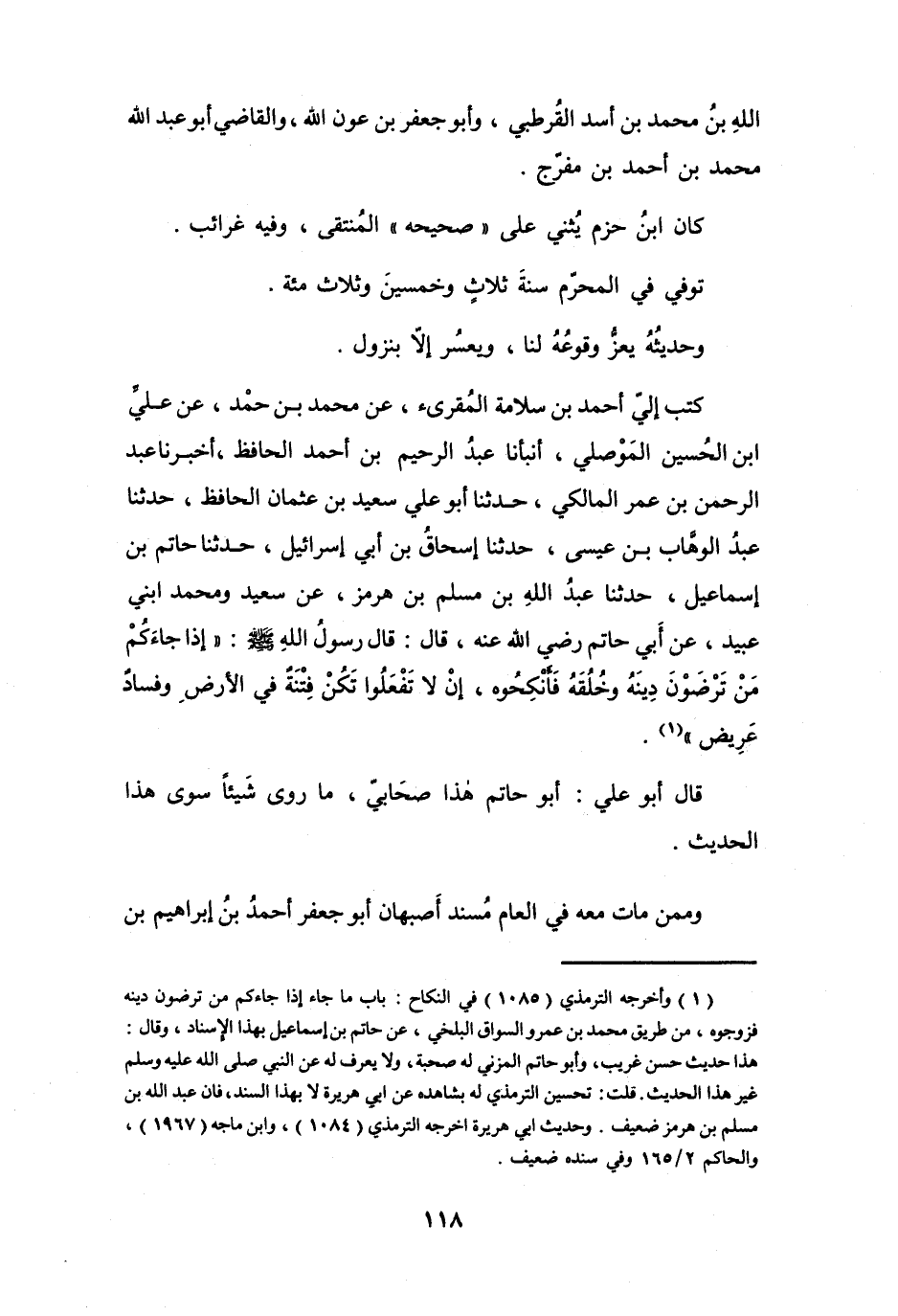 (1) وأخرجه الترمذي (1085) في النكاح: باب ما جاء إذا جاءكم من ترضون دينه فزوجوه، من طريق محمد بن عمرو السواق البلخي، عن حاتم بن إسماعيل بهذا الإسناد، وقال: هذا حديث حسن غريب، وأبو حاتم المزني له صحبة، ولا يعرف له عن النبي صلى الله عليه وسلم غير هذا الحديث.