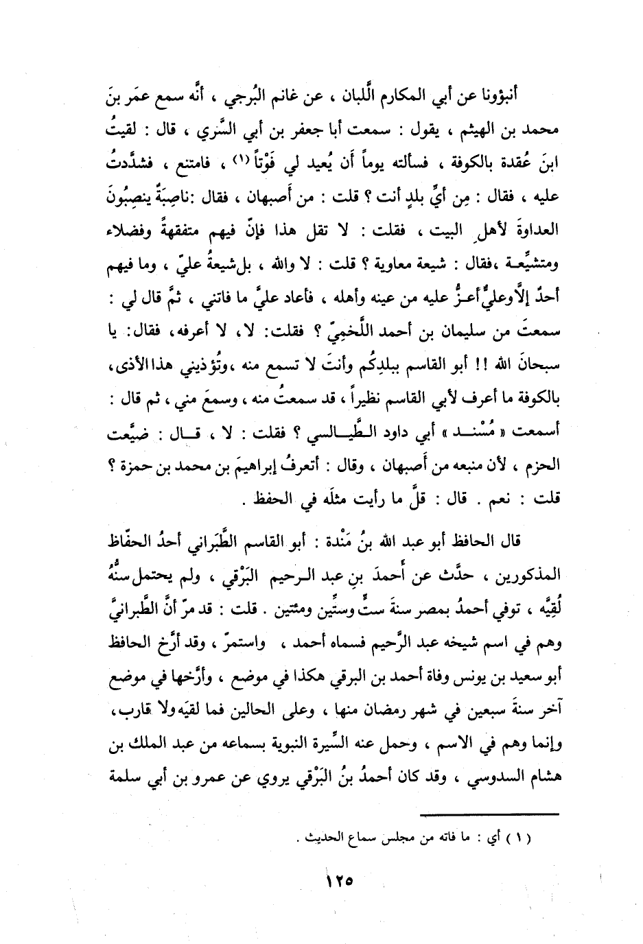 أَنبؤونَا عَنْ أَبِي المكَارمِ اللَّبَّانِ، عَنْ غَانِمٍ البُرجِيِّ، أَنَّهُ سَمِعَ عُمَرَ بنَ مُحَمَّدِ بنِ الهَيْثَمِ، يَقُوْلُ: سَمِعْتُ أَبا جَعْفَرٍ بنَ أَبِي السَّرِيِّ، قَالَ: لقيتُ ابنَ عُقدَةَ بِالكُوْفَةِ، فسأَلته يَوْماً أَنْ يُعيدَ لِي فَوْتاً (1) ، فَامْتَنَعَ، فشدَّدتُ عَلَيْهِ، فَقَالَ: مِنْ أَيِّ بلدٍ أَنْتَ؟
