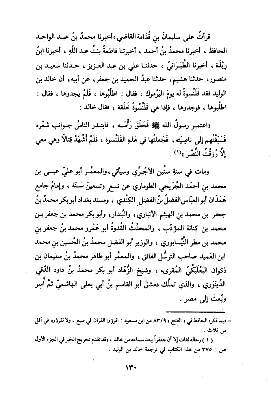 قَرَأْتُ عَلَى سُلَيْمَانَ بنِ قُدَامَةَ القَاضِي، أَخْبَرَنَا مُحَمَّدُ بنُ عَبْدِ الواحدِ الحَافِظُ، أَخْبَرَنَا مُحَمَّدُ بنُ أَحْمَدَ، أَخبرتنَا فَاطِمَةُ بِنْتُ عَبْدِ اللهِ، أَخْبَرْنَا ابْنُ رِيْذَةَ، أَخْبَرَنَا الطَّبَرَانِيُّ، حَدَّثَنَا عَلِيُّ بنُ عَبْدِ العَزِيْزِ، حَدَّثَنَا سَعِيْدُ بنُ مَنْصُوْرٍ، حَدَّثَنَا هُشَيْمٌ، حَدَّثَنَا عبدُ الحمِيدِ بنُ جَعْفَرٍ، عَنْ أَبيِهِ، أَنَّ خَالِدَ بنَ الوَلِيْدِ فَقَدَ قَلَنْسوَةً لَهُ يَوْمَ اليَرْمُوْكِ، فَقَالَ: اطلُبُوهَا، فَلَمْ يجدُوهَا، فَقَالَ: اطلُبُوهَا، فَوَجَدُوهَا، فَإِذَا هِيَ قَلَنْسُوَةٌ خَلَقةٌ، فَقَالَ خَالِدٌ: