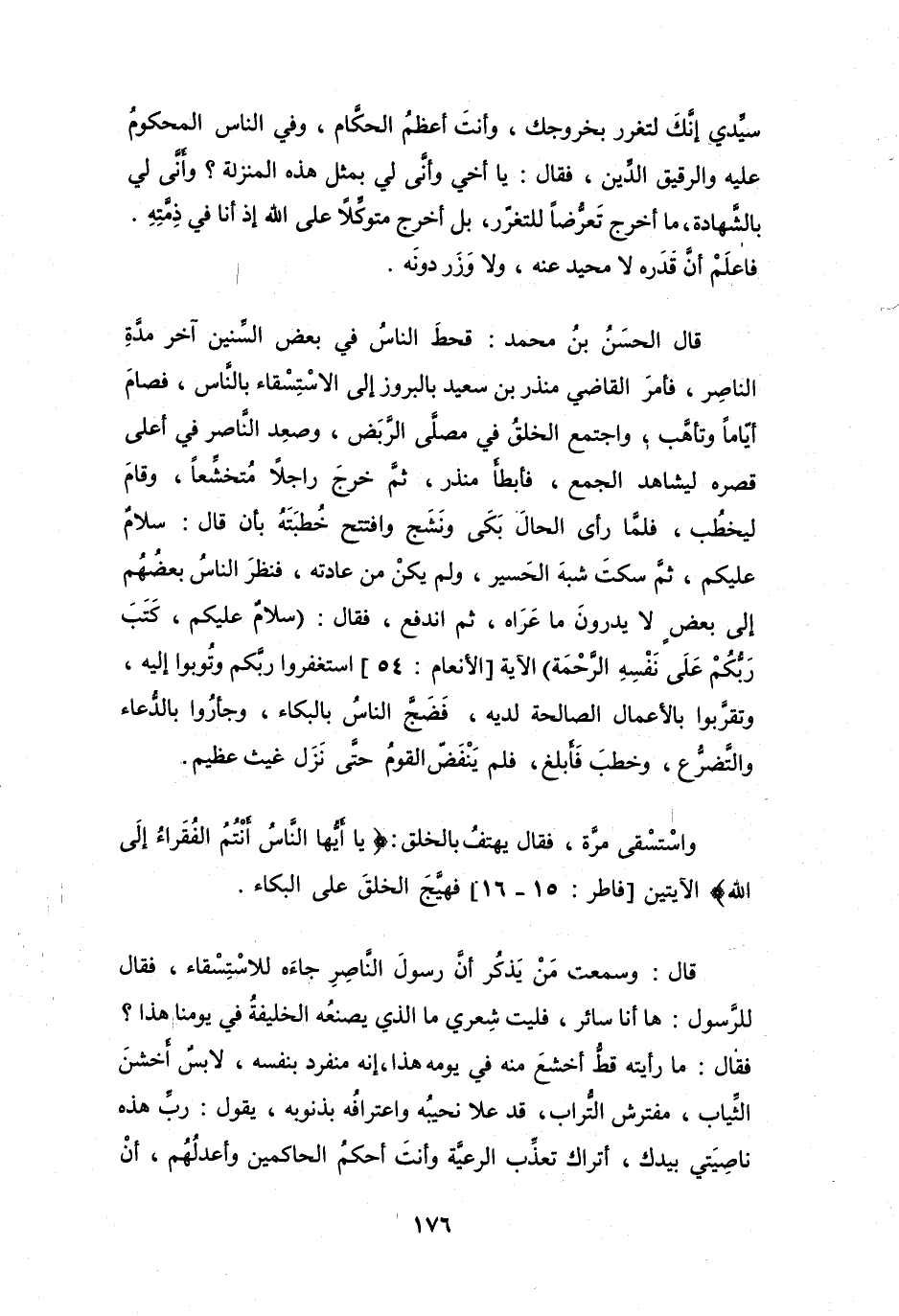 قَالَ: وَسَمِعْتُ مَنْ يَذكُرُ أَنَّ رَسُوْلَ النَّاصِرِ جَاءهُ للاسْتِسْقَاءِ، فَقَالَ لِلرَّسُوْلِ: هَا أَنَا سَائِرٌ، فَلَيْتَ شِعْرِي مَا الَّذِي يَصْنَعُهُ الخَلِيْفَةُ فِي يَوْمنَا هَذَا؟